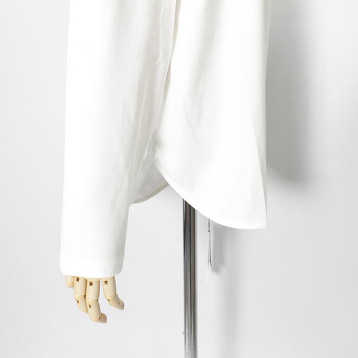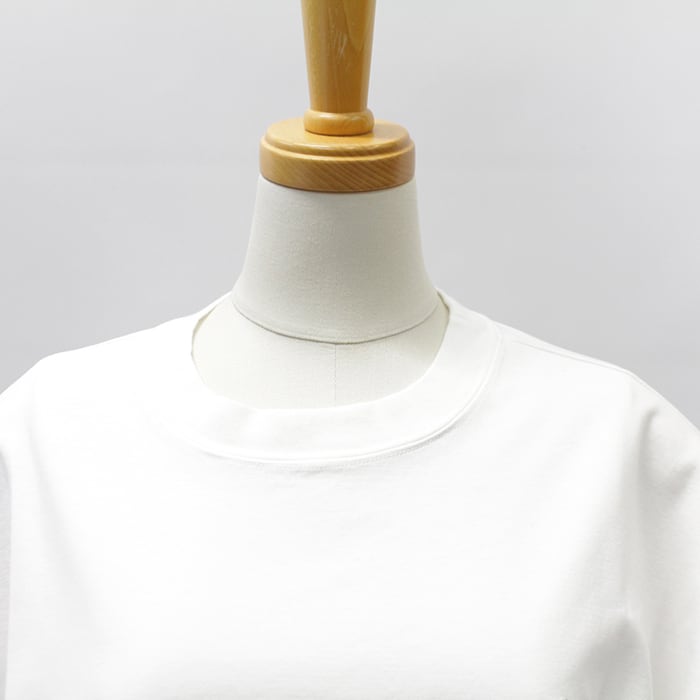 綿の細番手原料をハイゲージで編み上げたポンチ素材に特殊加工を施し、上品な光沢とハリ感、そして高いストレッチ性を実現しました。