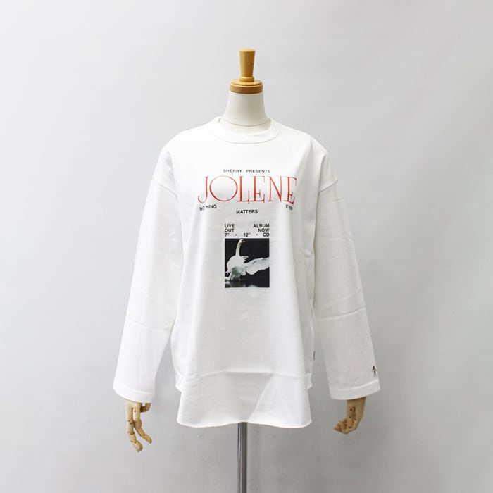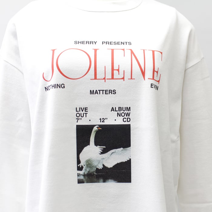 胸元には「SHERRY PRESENTS / JOLENE」のタイポグラフィと、静かな余韻を感じさせるスワンのイメージをレイアウト。