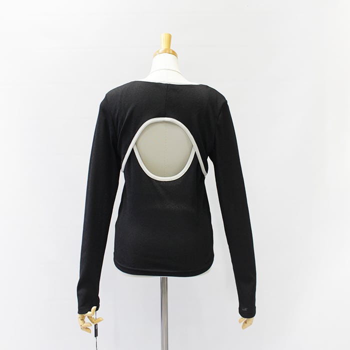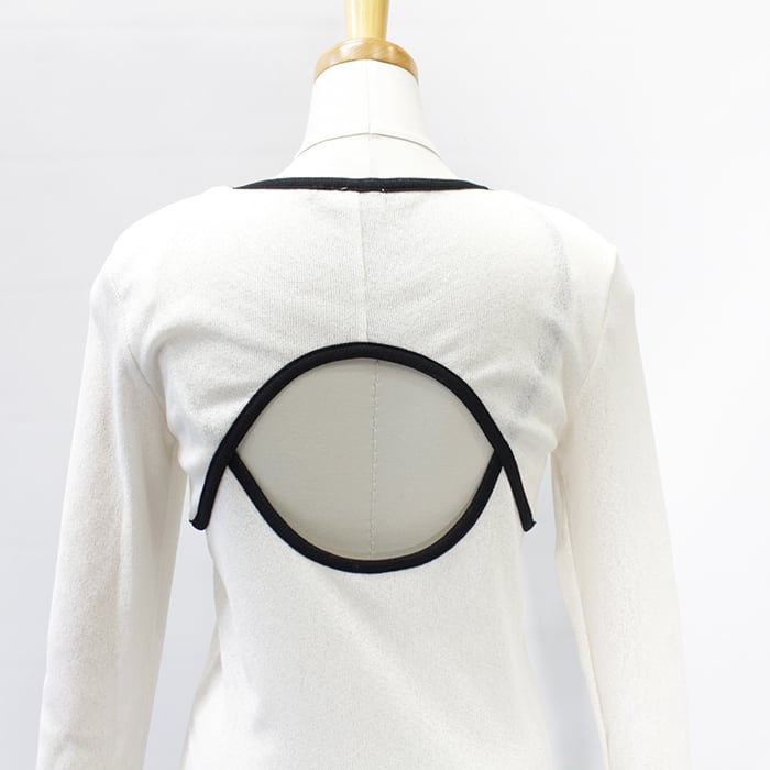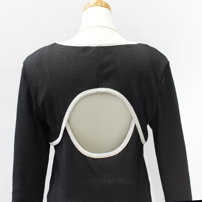 背中部分には大胆なカットアウトでサークルラインを描きエッジィなデザイン。