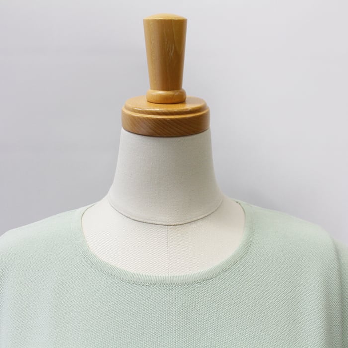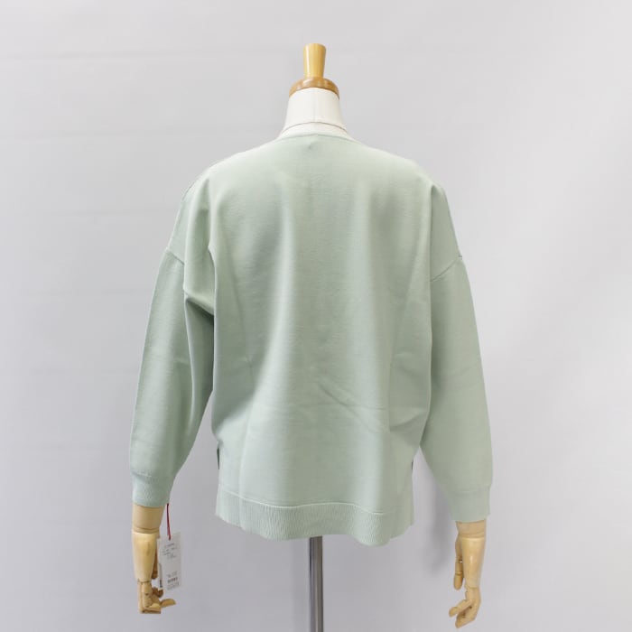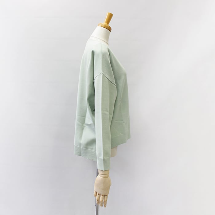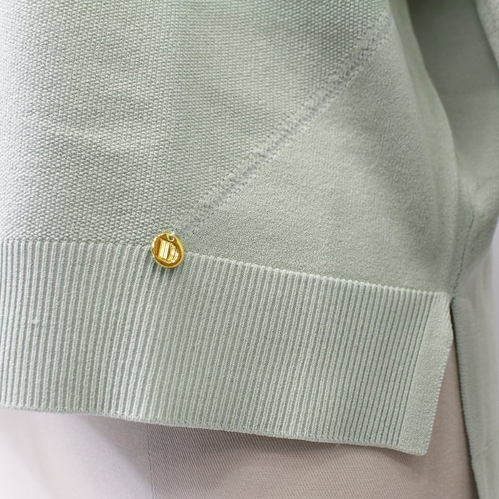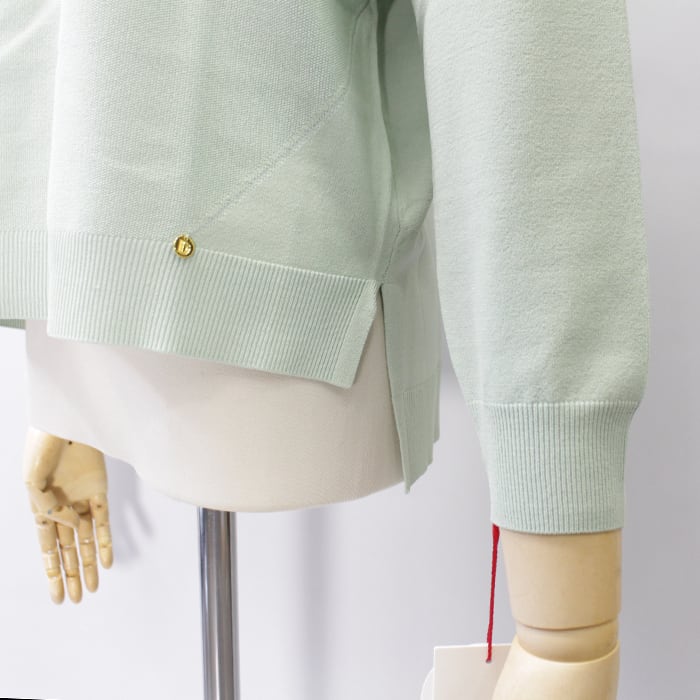 フロント部分が鹿の子編みでサイドから裾にかけての切替えなど、シンプルながらデザインの効いた一枚。