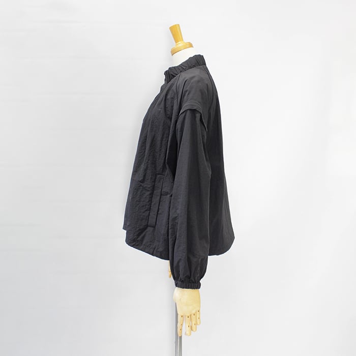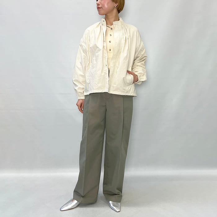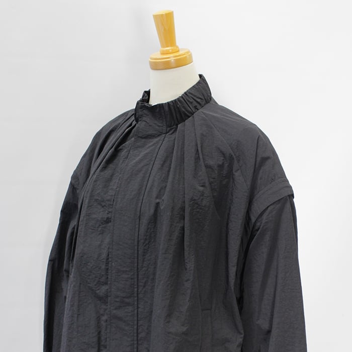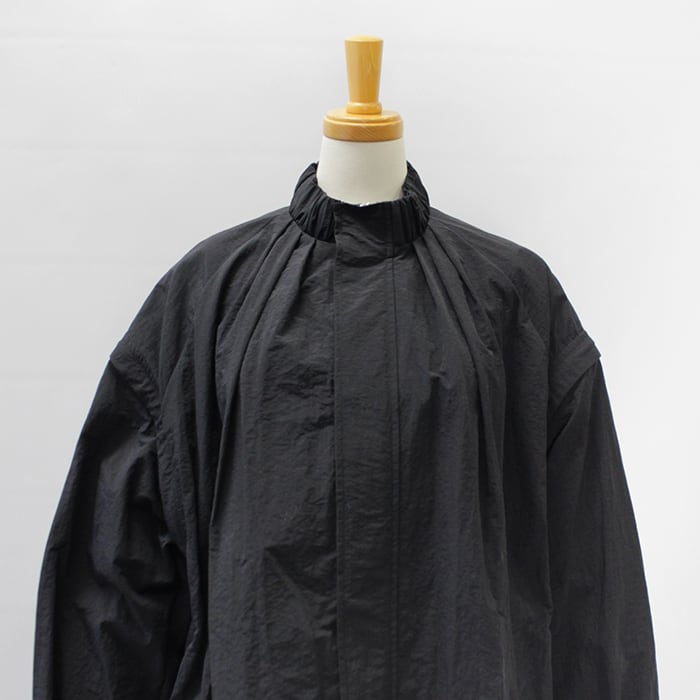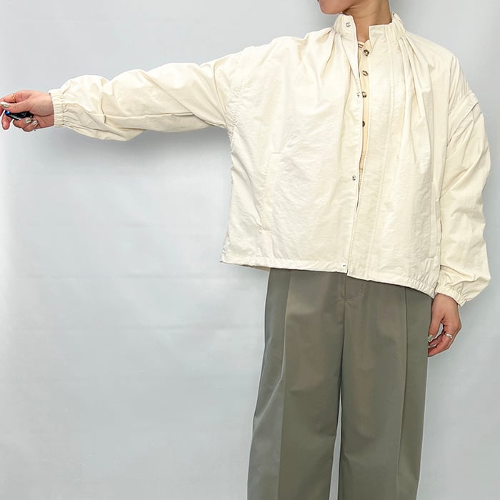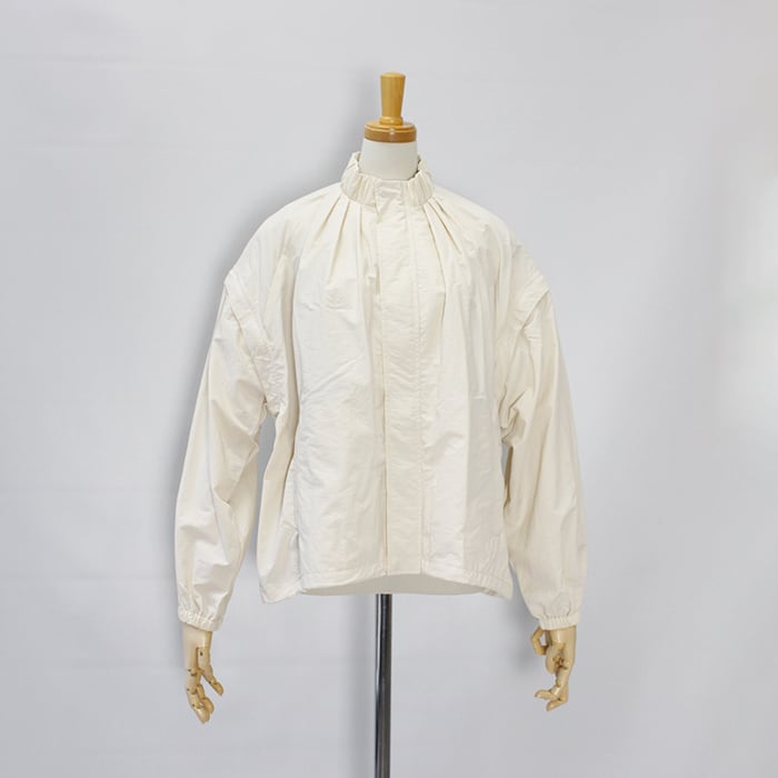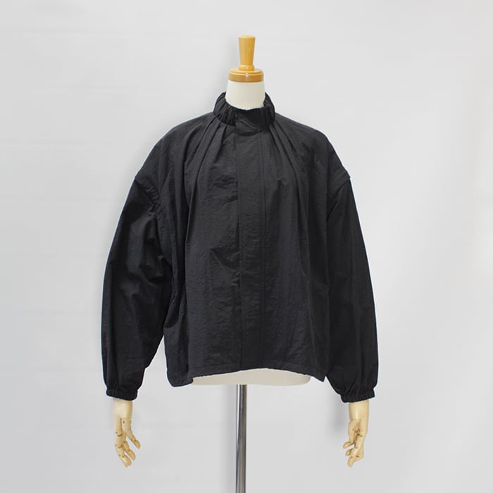 スタンドカラーの襟元に加え、袖口と裾にはギャザーを施し、立体感のあるシルエットに仕上げています。