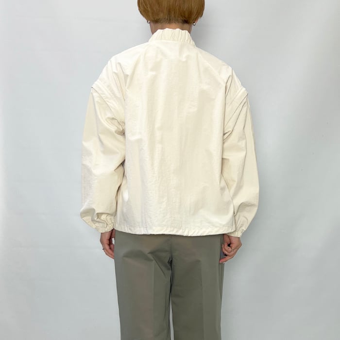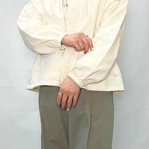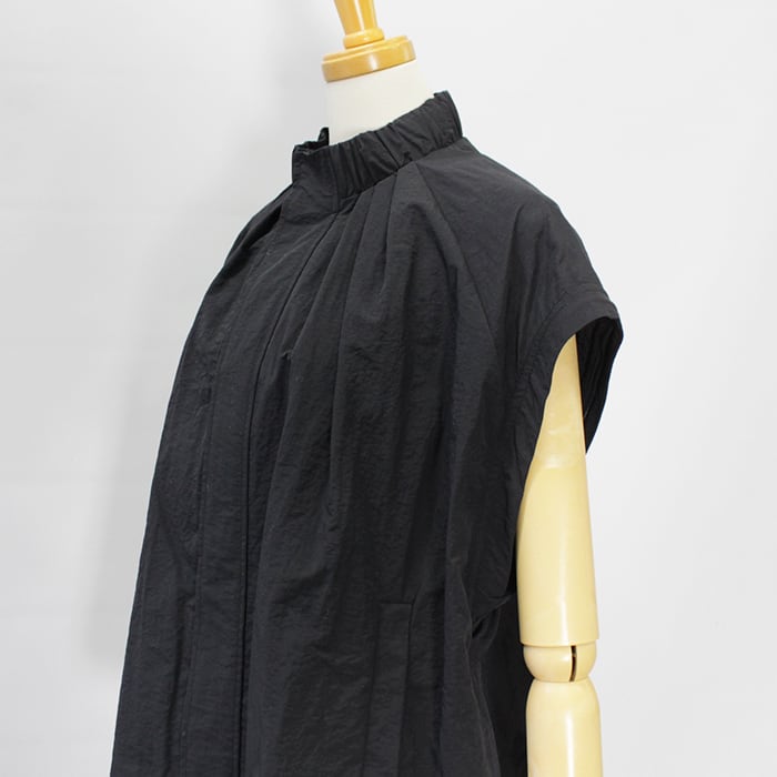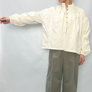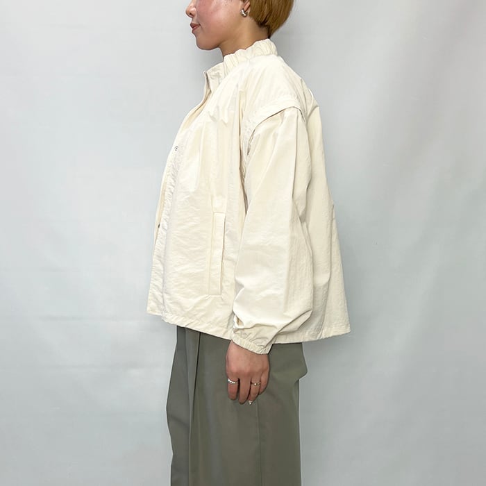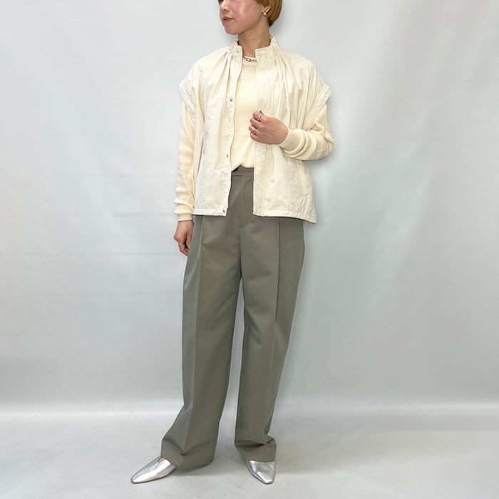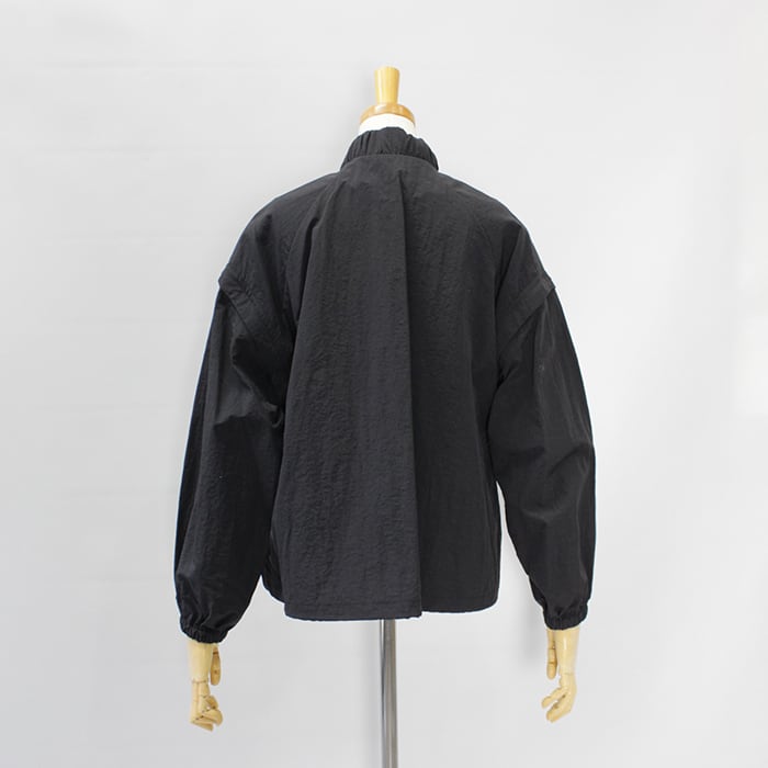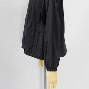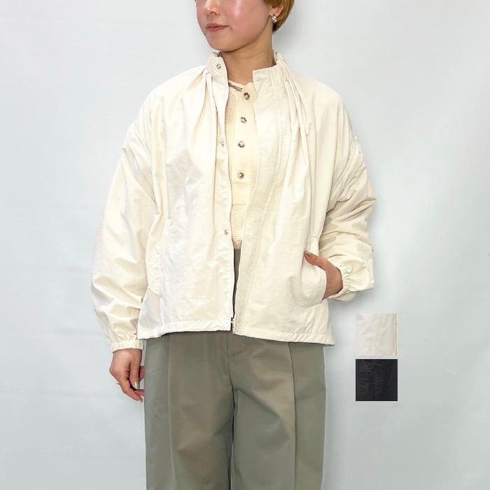 スタンドカラーの襟元に加え、袖口と裾にはギャザーを施し、立体感のあるシルエットに仕上げています。