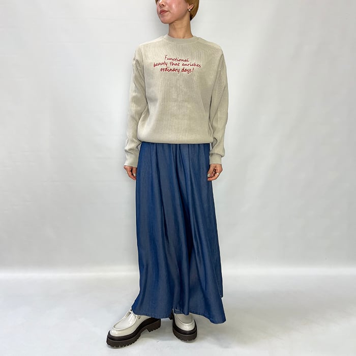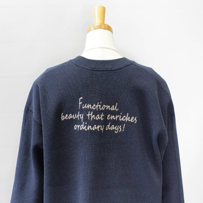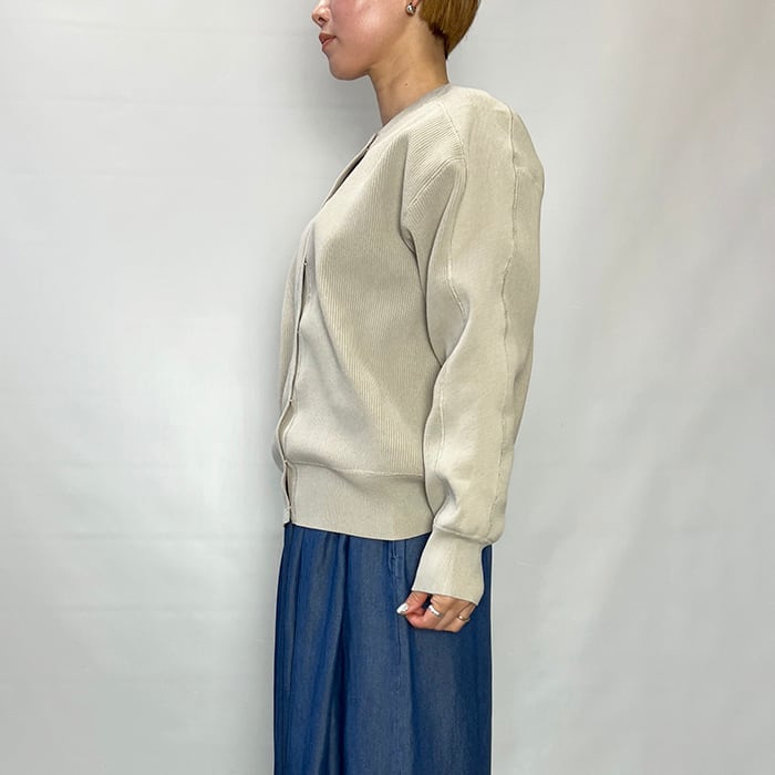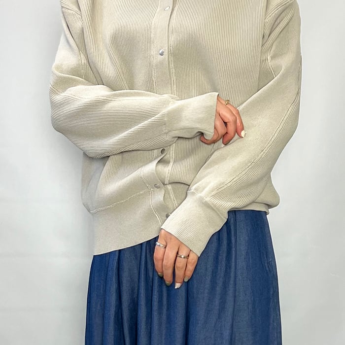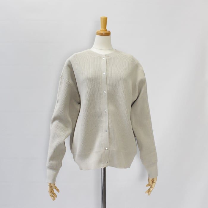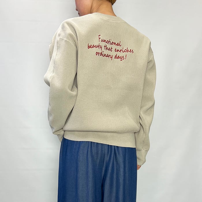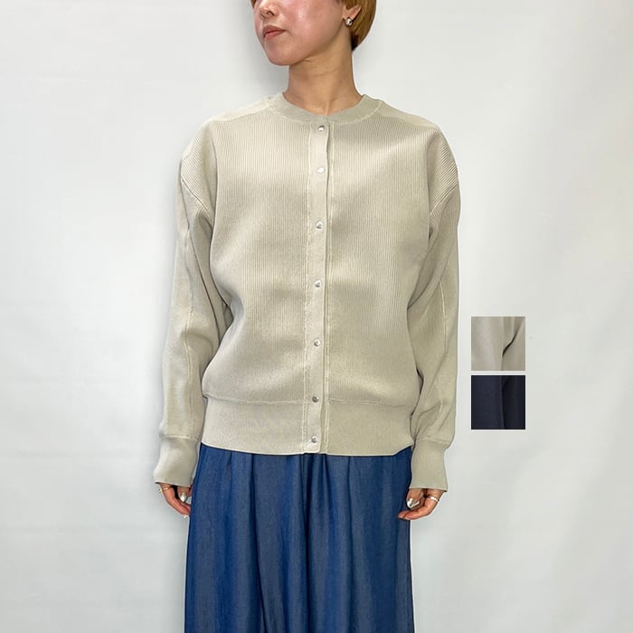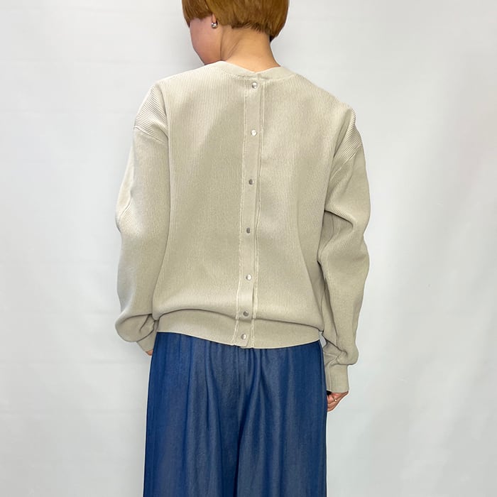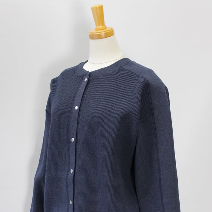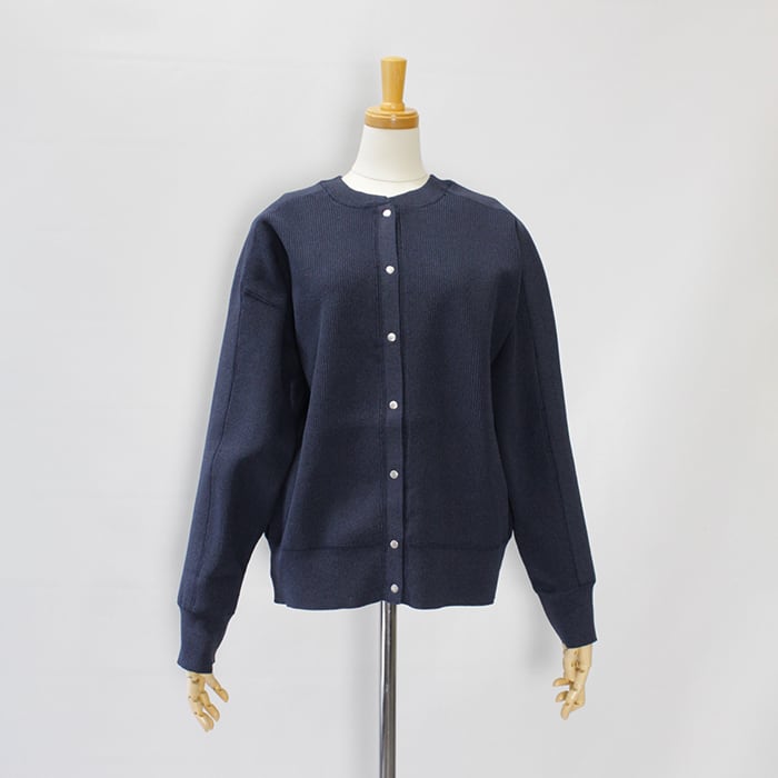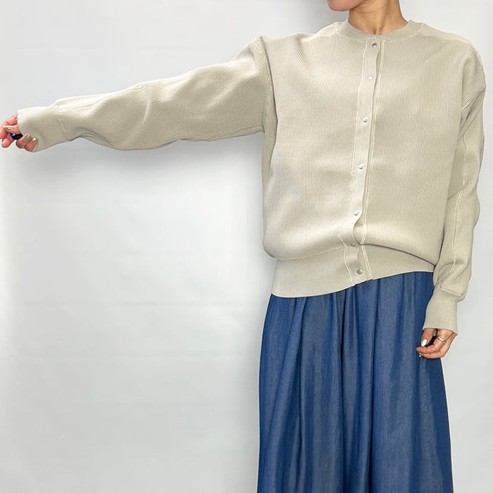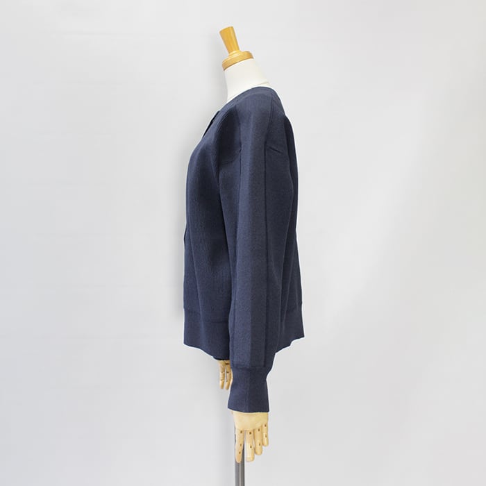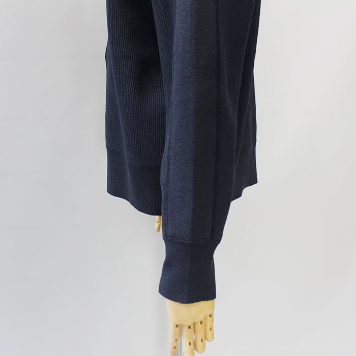 凹凸感のある畦編みが表情豊かで、しなやかさと程よい肉感、さらにポリエステルならではの軽さを併せ持ち、着用時のシルエットを美しく見せます。
