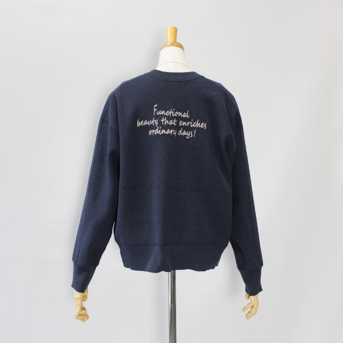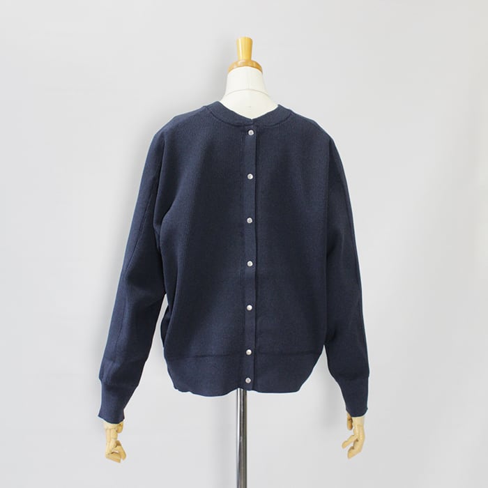 前後どちらでも着用でき、トップスとしても活躍するカジュアルなニットカーディガンです。