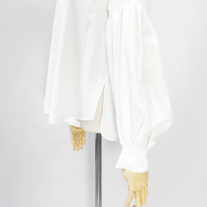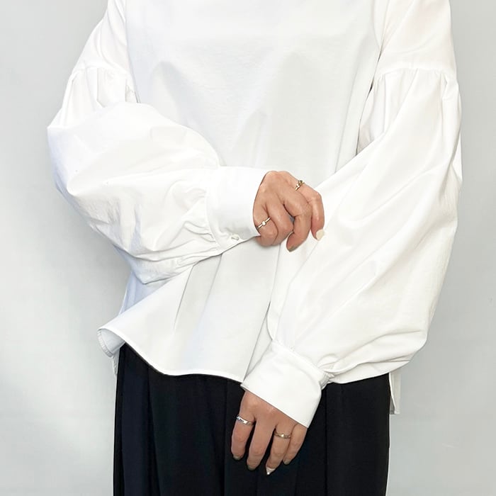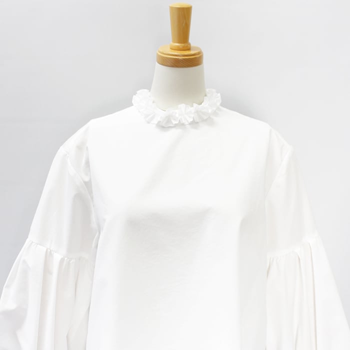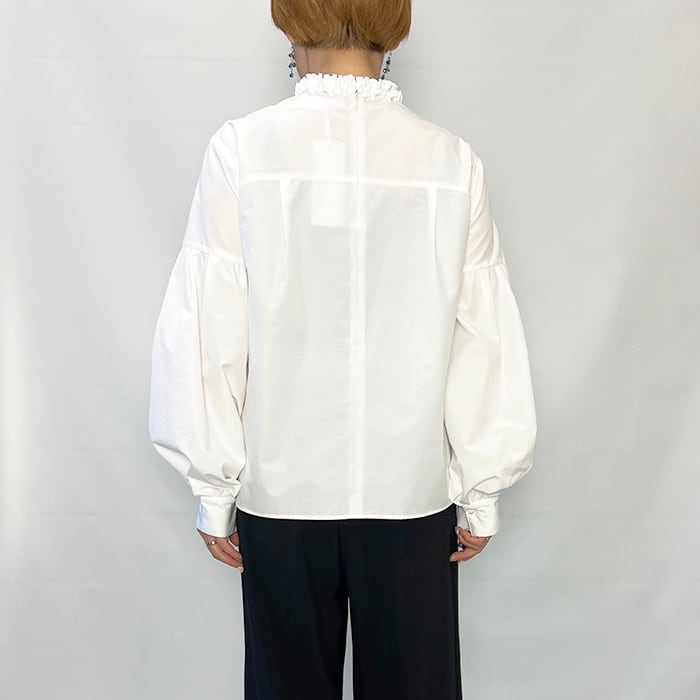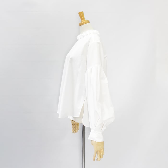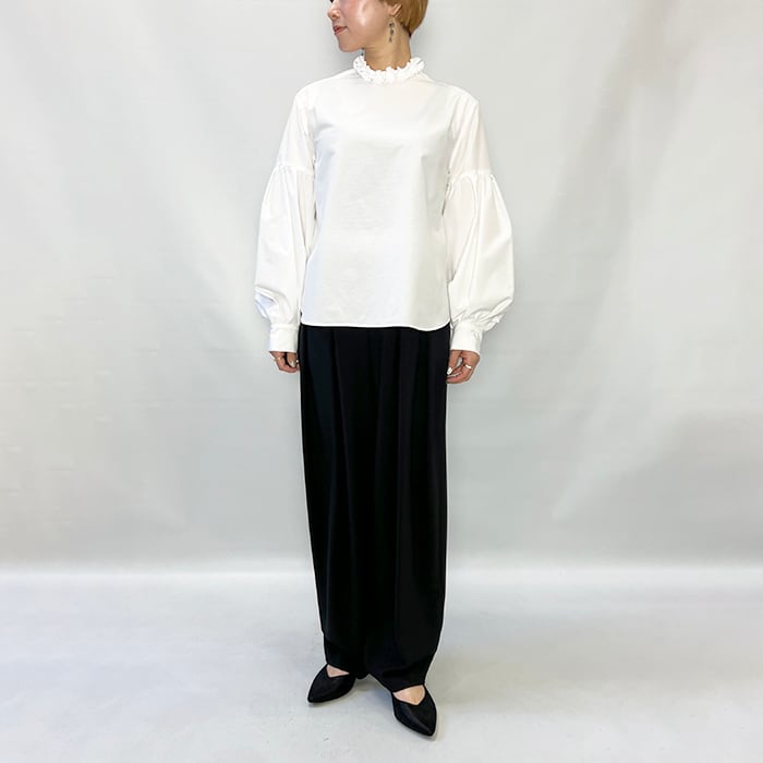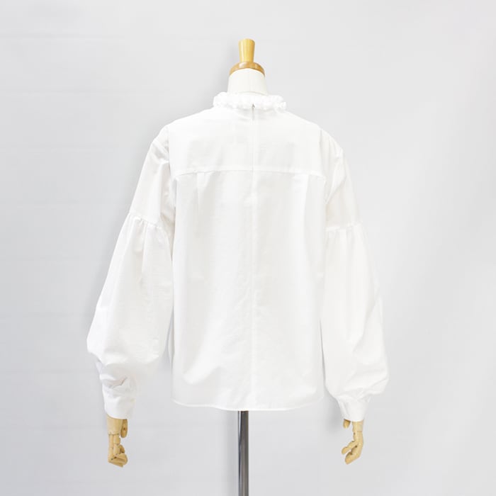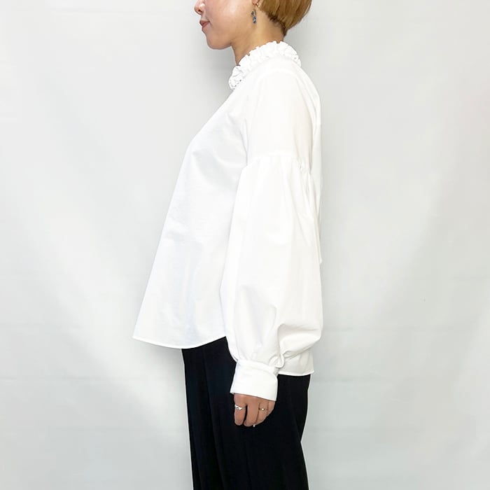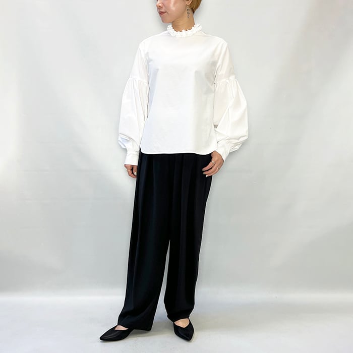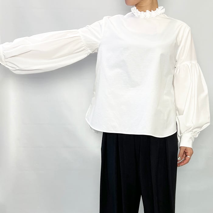 すっきりとしたシンプルな身頃に、特殊ミシンでつくるバイヤスタックフリルとボリューム袖が好バランスな華やぎブラウスです。