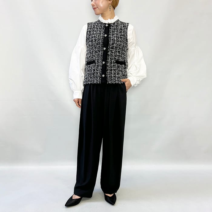 ジャケットやベストにレイヤードしていただきやすく、シンプルなボトム合わせでも存在感のある万能アイテムです。
