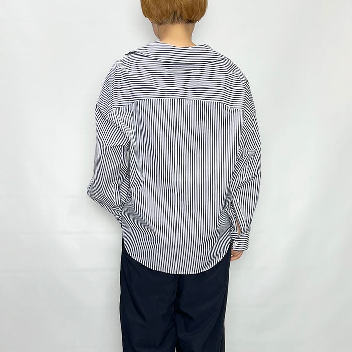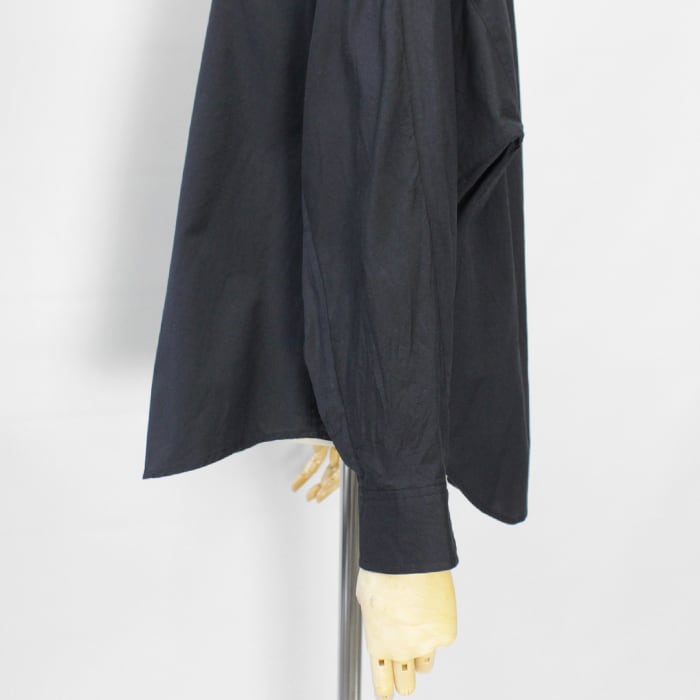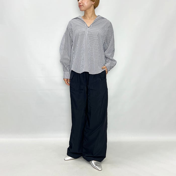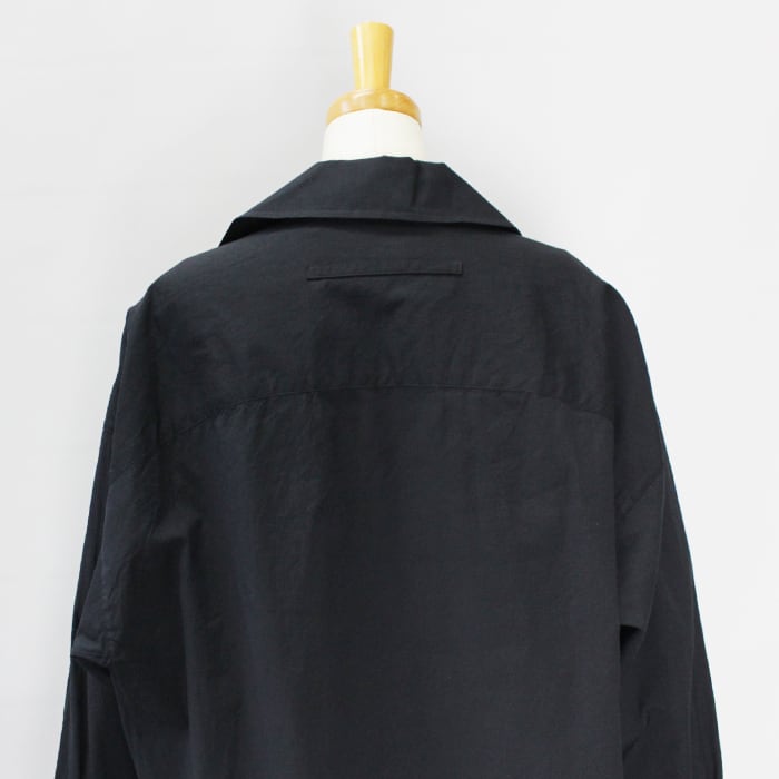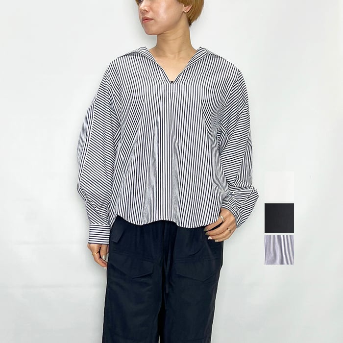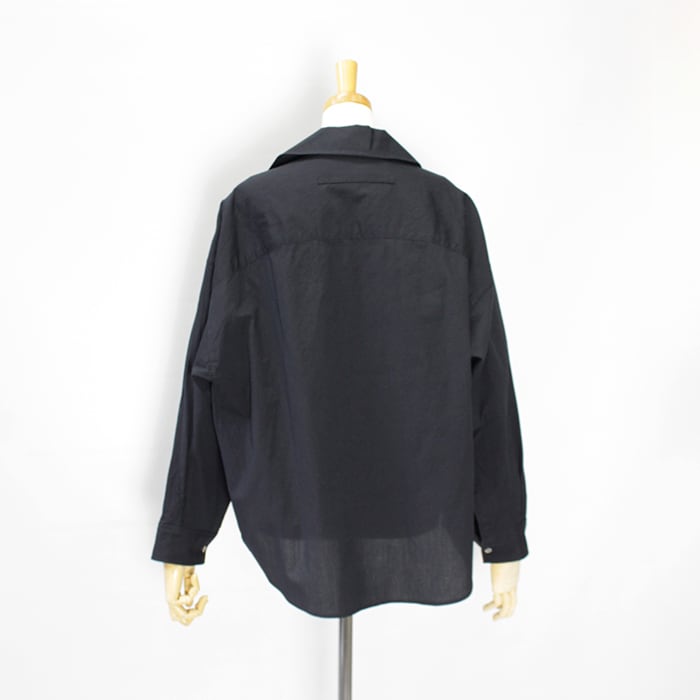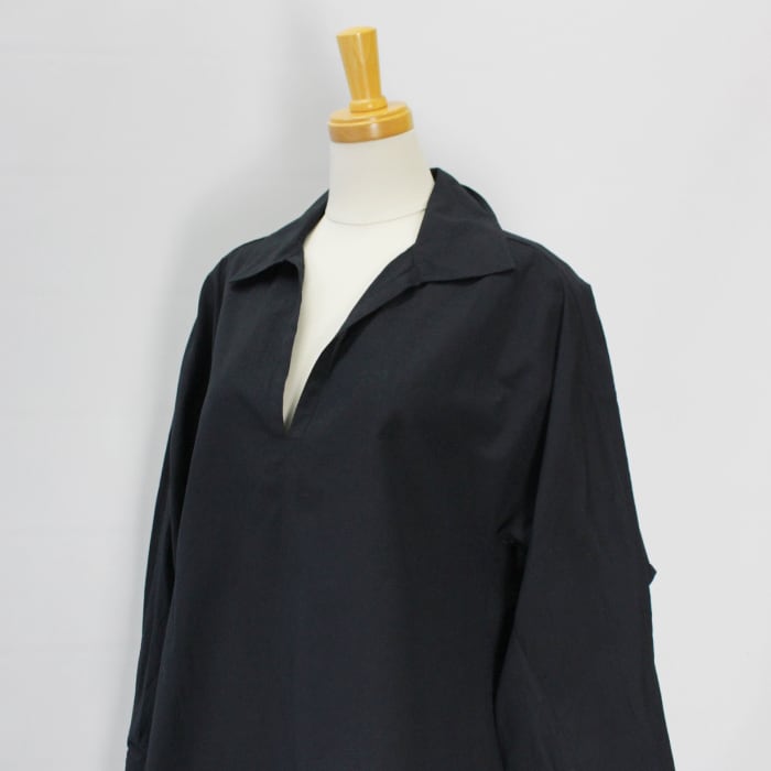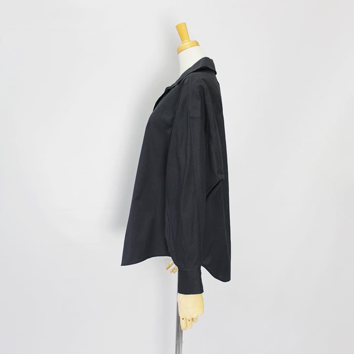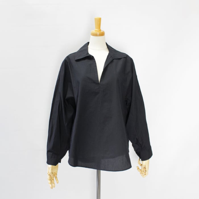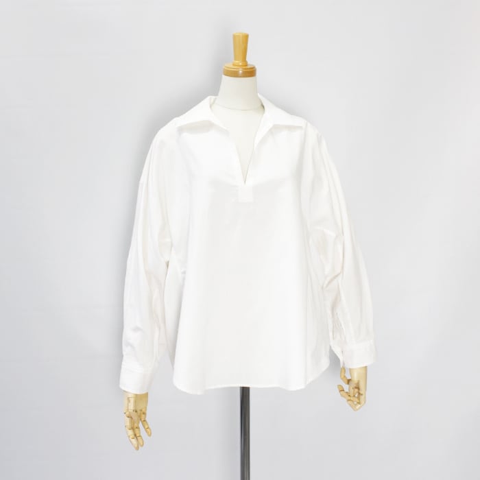 スッキリとしたキーネックの衿元と、繊細なギャザーとたっぷりした分量感、立体的なパターンメイキングが印象的なシャツブラウスです。
