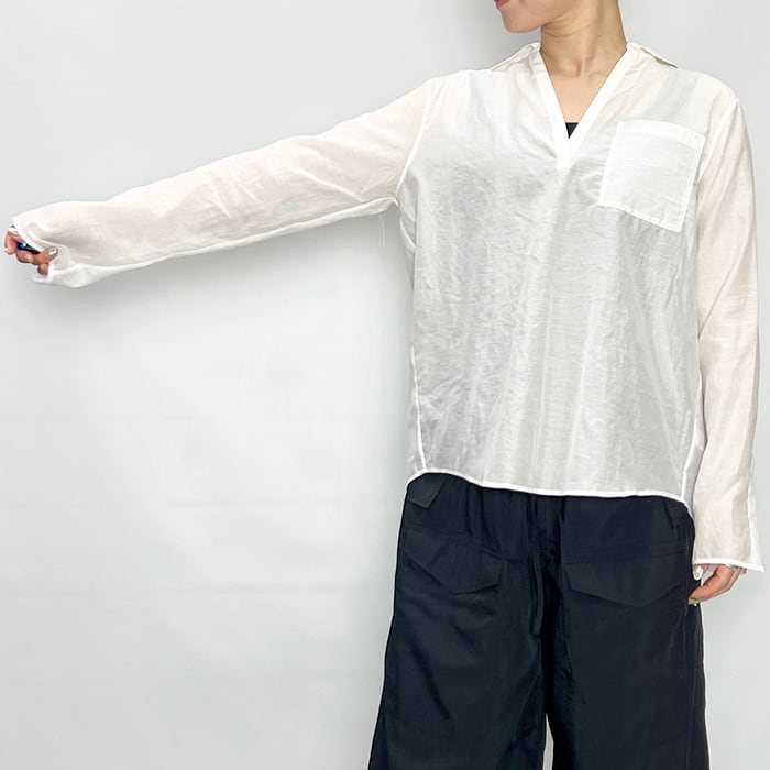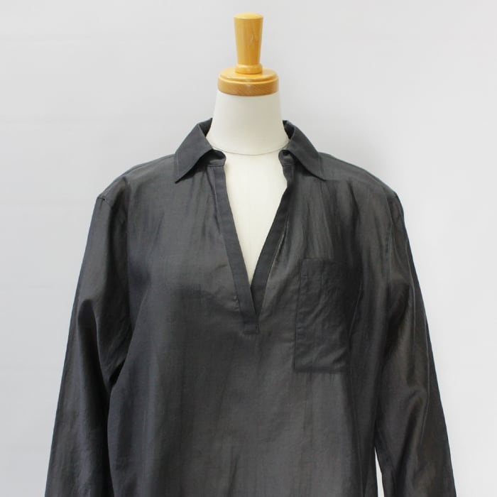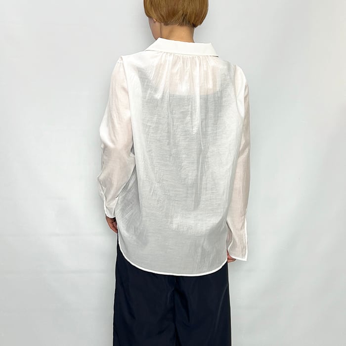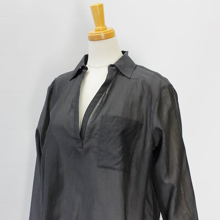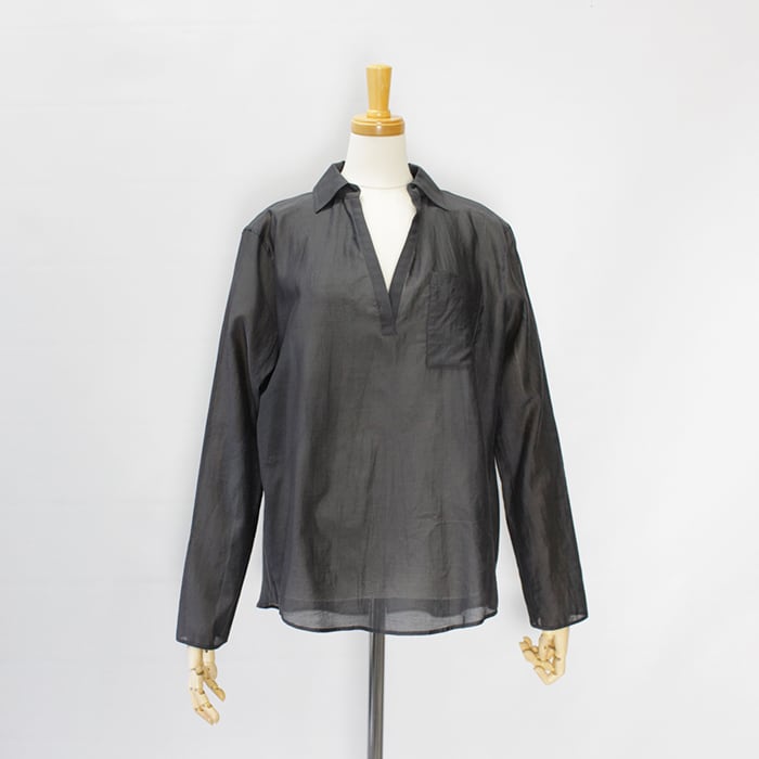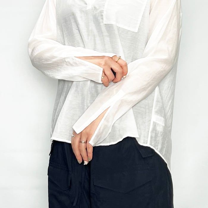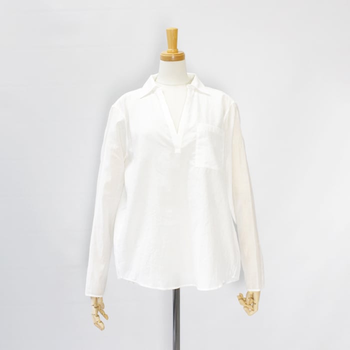 コットンシルクのシアーな繊細さと、すっきりした衿元や袖口のデザインの甘辛バランスが良い、クリーンで知的なスキッパーシャツです。