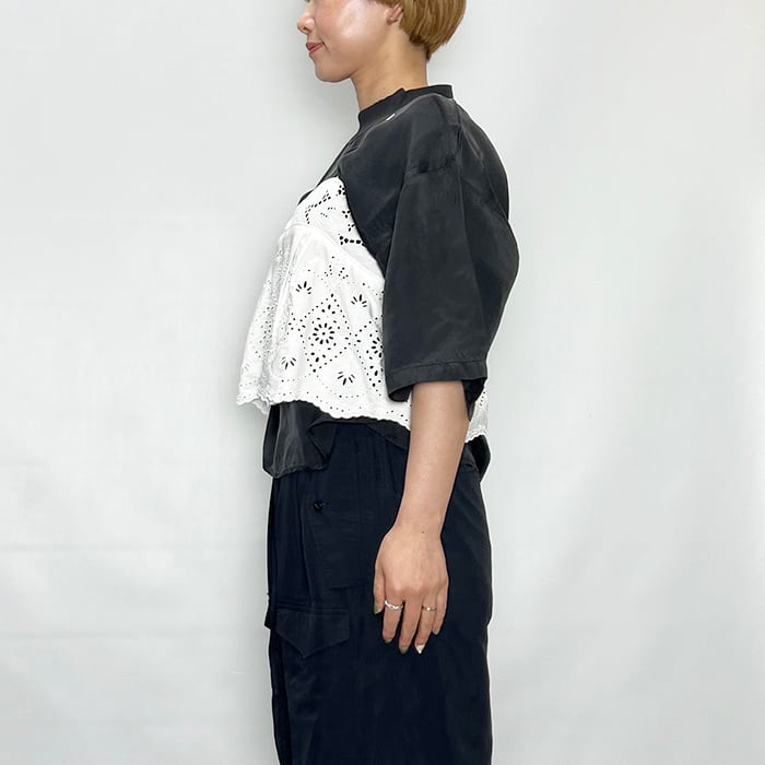 大胆さと繊細さを併せ持つオリジナルレースは、国内の産地にて生地に直接刺繍とカッティングの加工を施しているエンブロイダリーレースです。