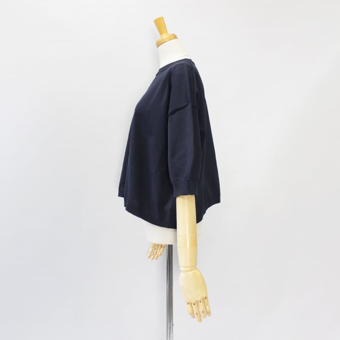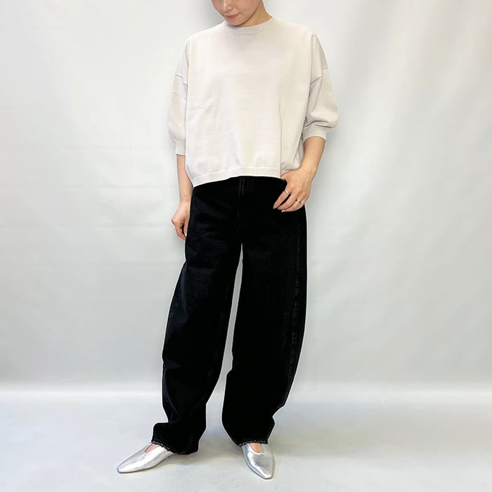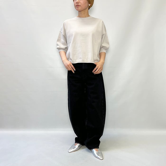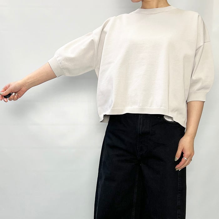 ワイドシルエットの天竺クルーネックプルオーバー。