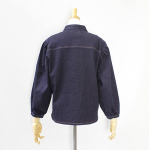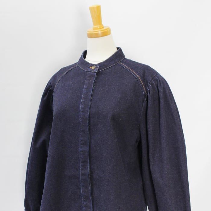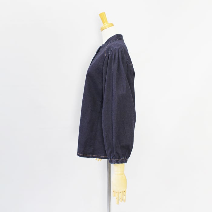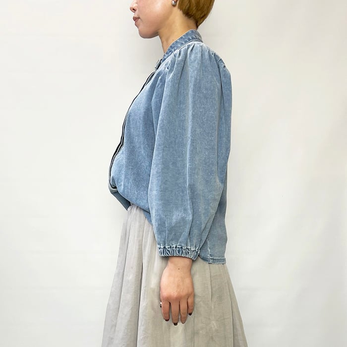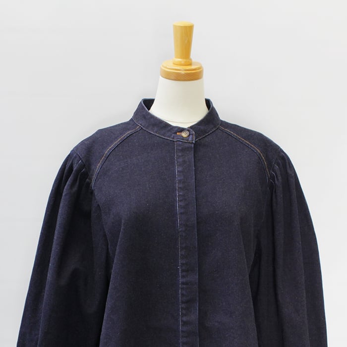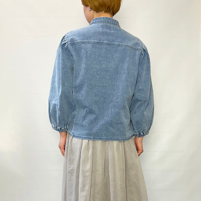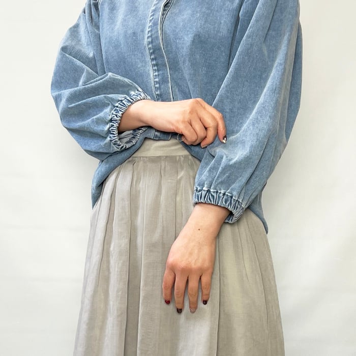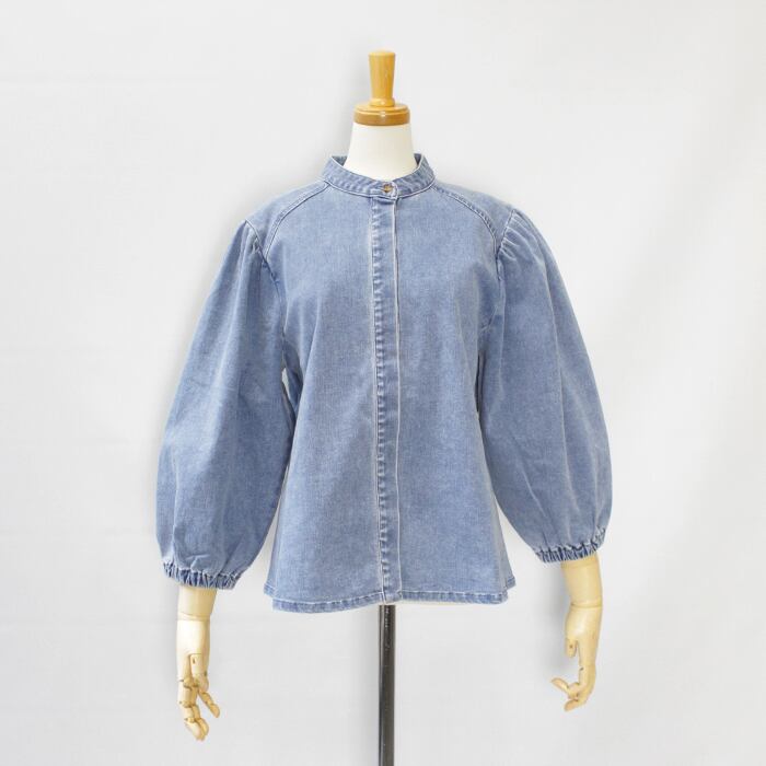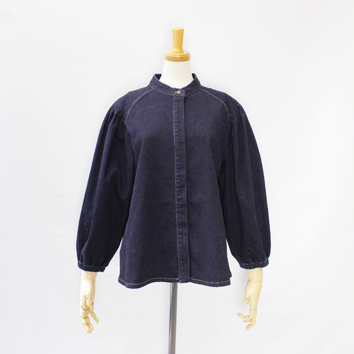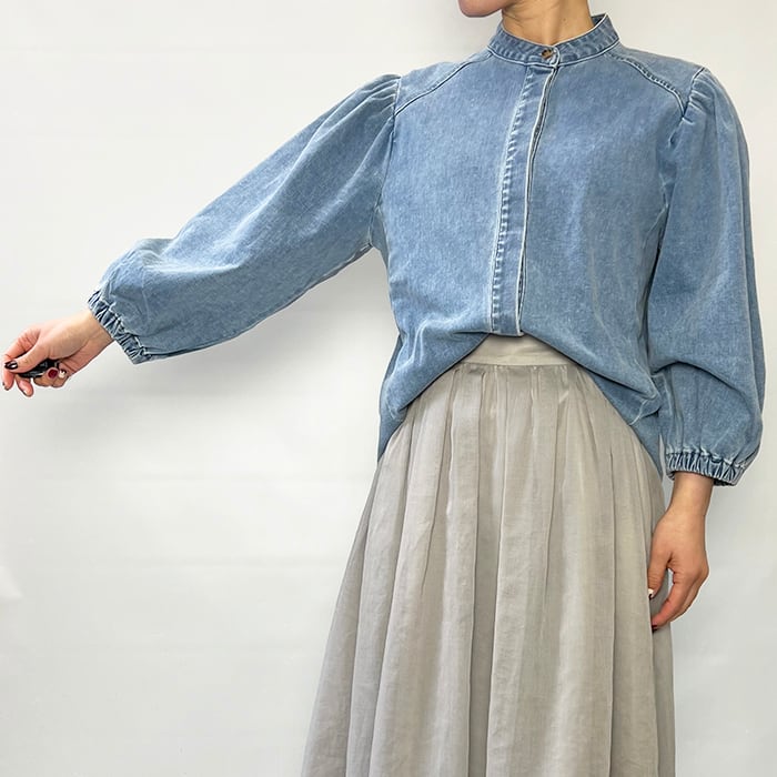 すっきりとしたバンドカラーのデニムブラウス。