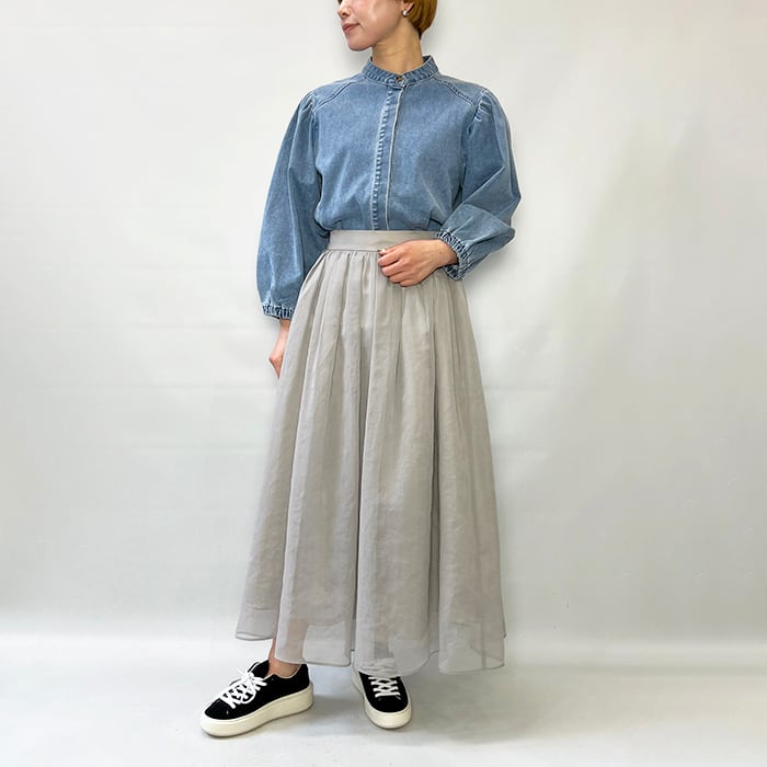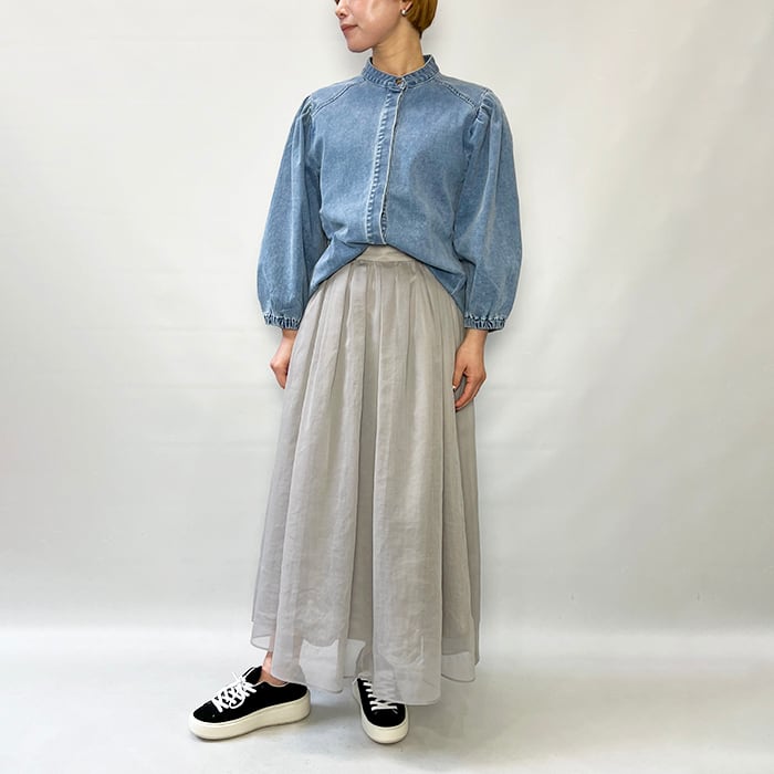 肩に施したギャザーとボリュームのある袖がカジュアルながらも上品な印象に仕上がっています。