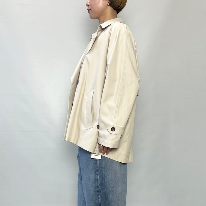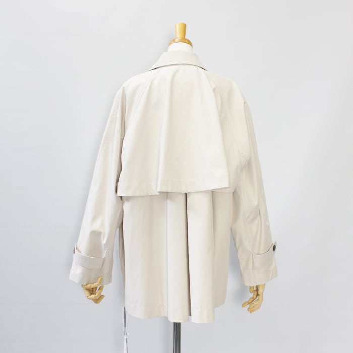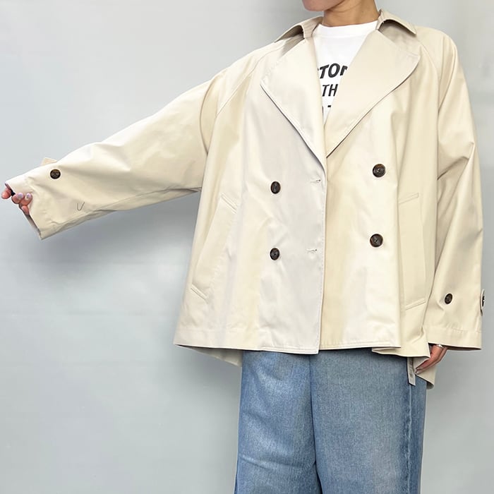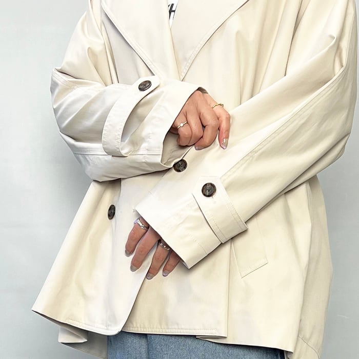 ショート丈のトレンチコートは、さっと羽織るだけでトレンドのスタイリングが決まります。