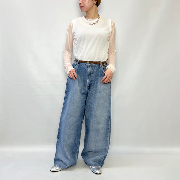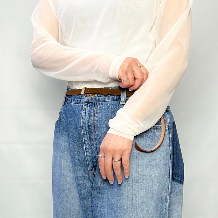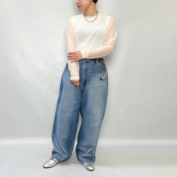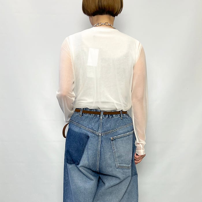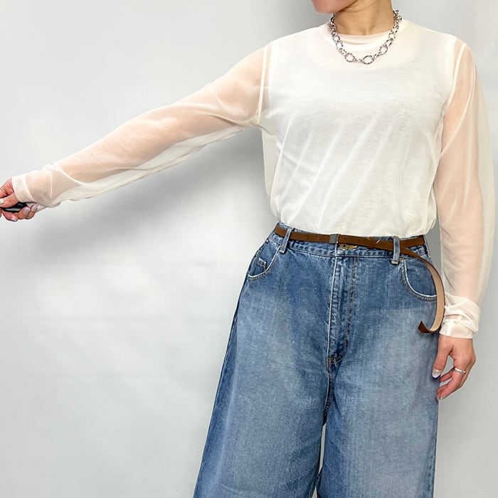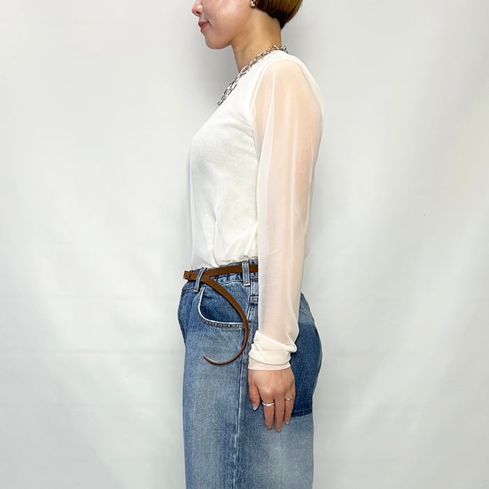 裾から少しインナーが出るように計算したレイヤードトップスは、透け感のあるロングスリーブをインナーとのセットで着用しやすいバランスで組み合わせしています。