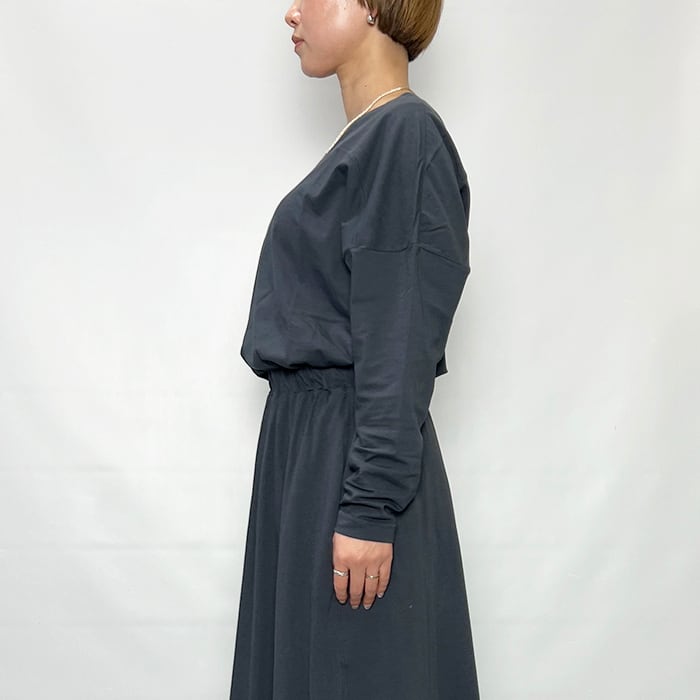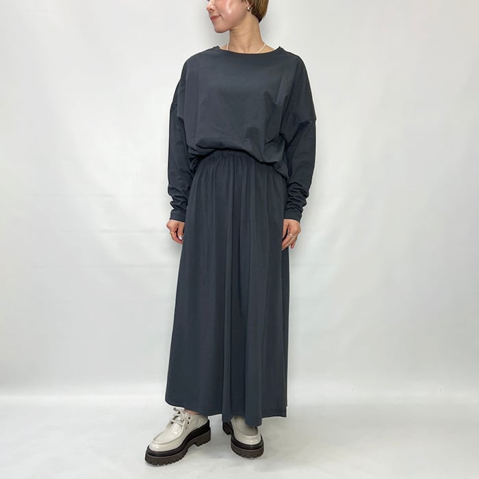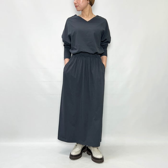 裾はロック始末にすることで抜けもプラスされ同素材のスカートを合わせたセットアップスタイルもおすすめです。