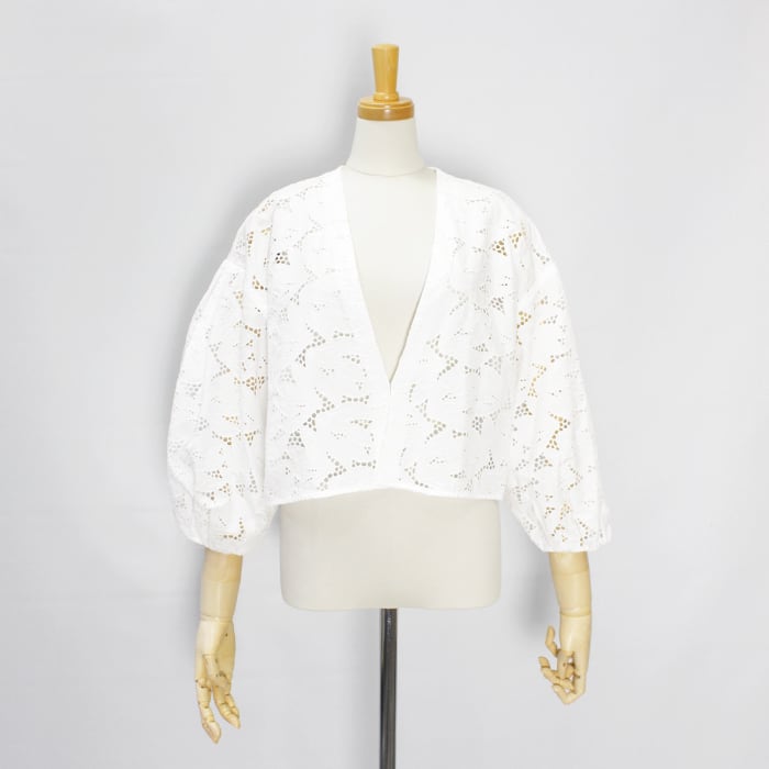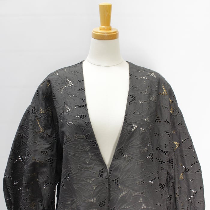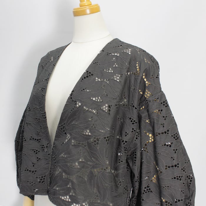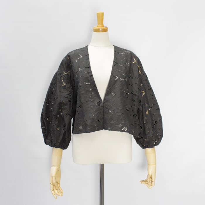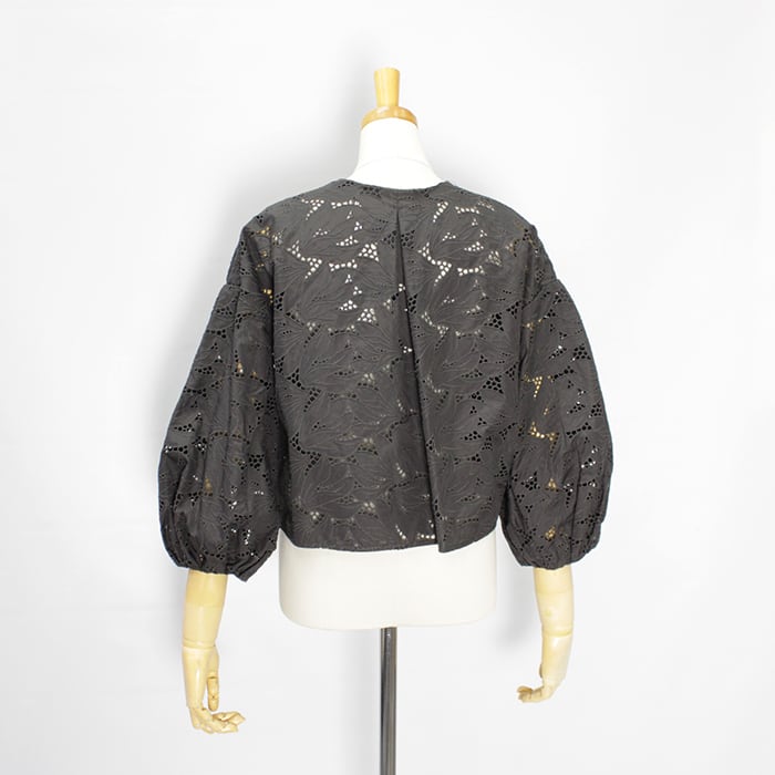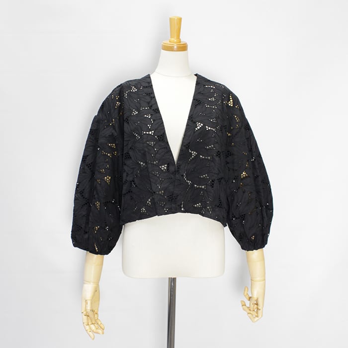レースを生かすように、削ぎ落とされたデザインで大胆さと上品さ、繊細さを併せ持つショート丈のレースジャケットは、カジュアルシーンでもきちんとした場所にもフィットする1品です。