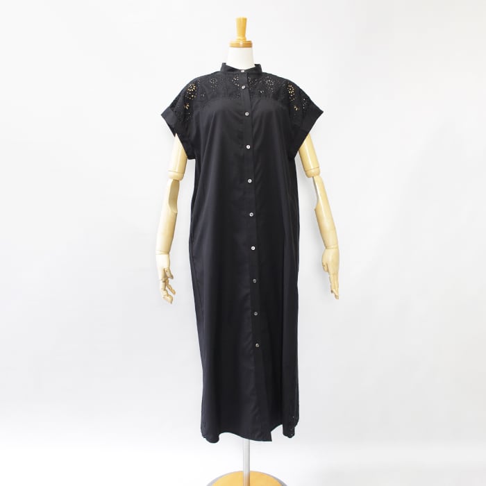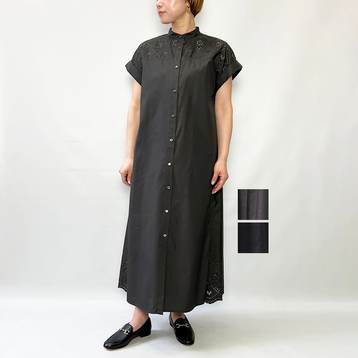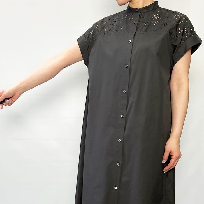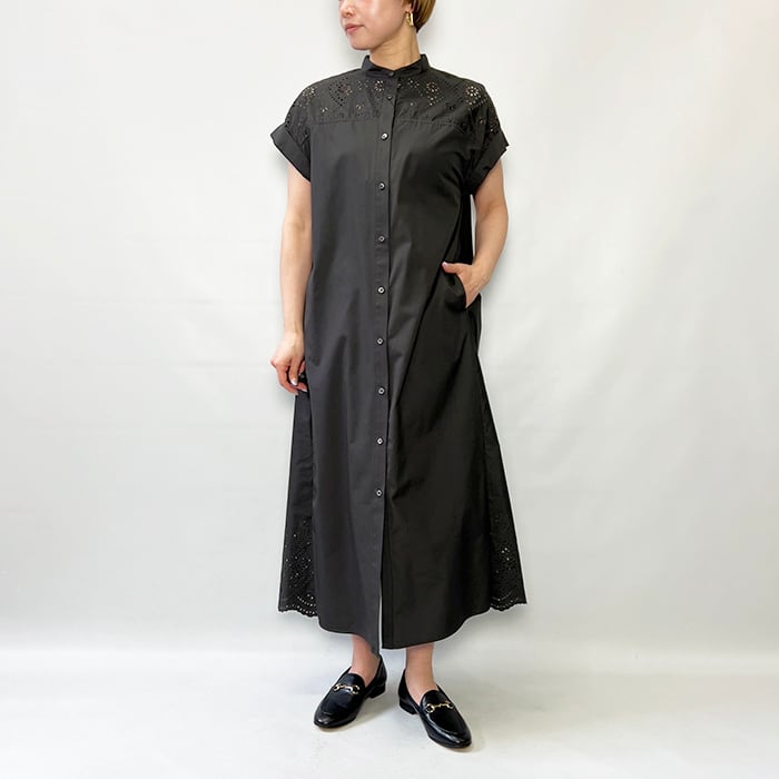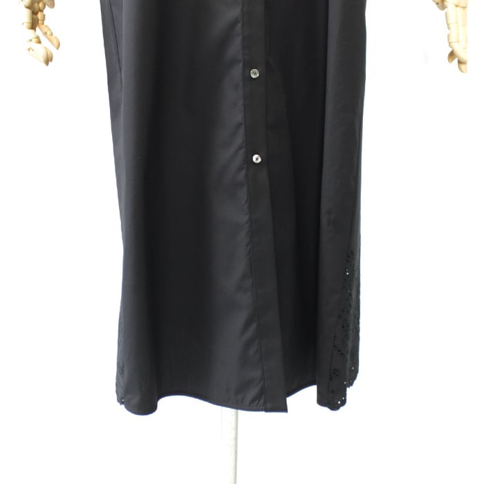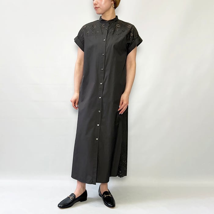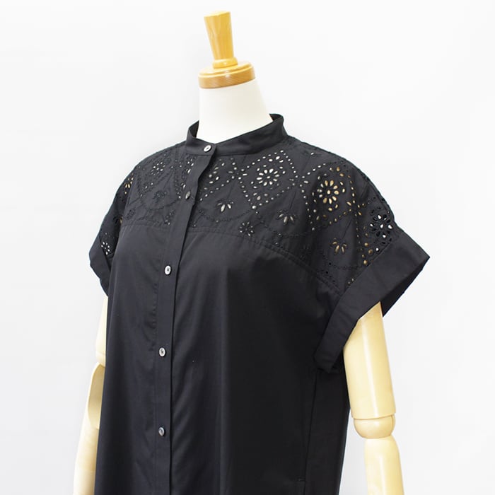 シャツの凛々しさとレースの女性らしさを合わせたデザインで、1枚で存在感たっぷりのロングシャツドレスです。