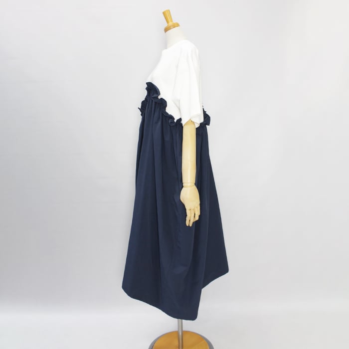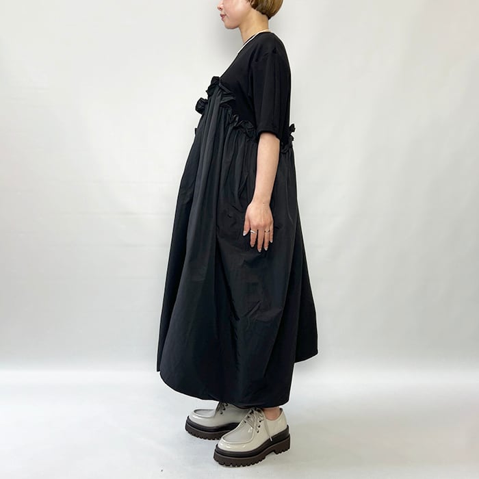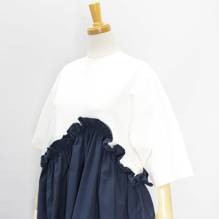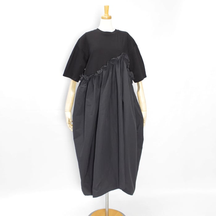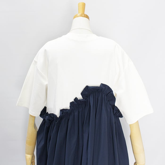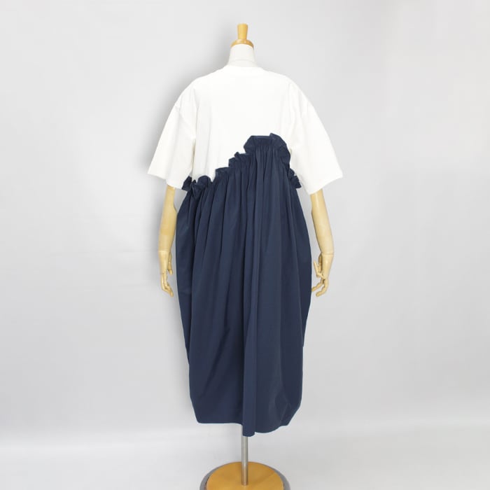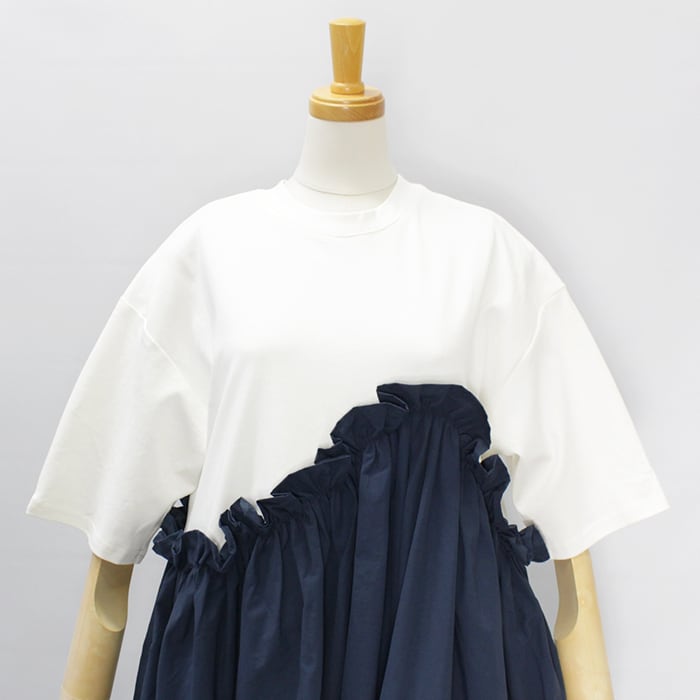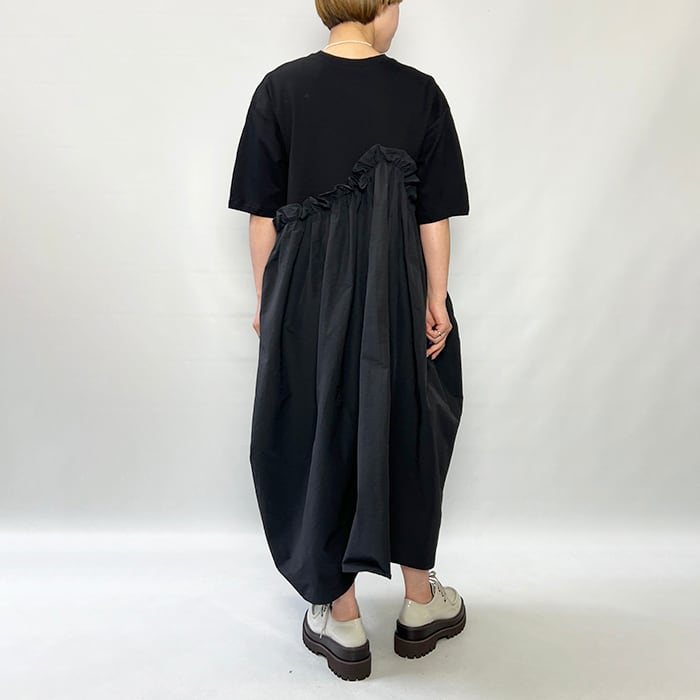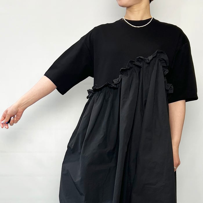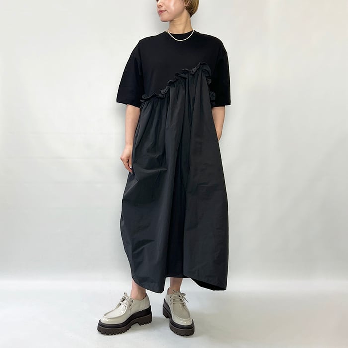 カットソー素材と布帛素材をドッキングしたワンピース。