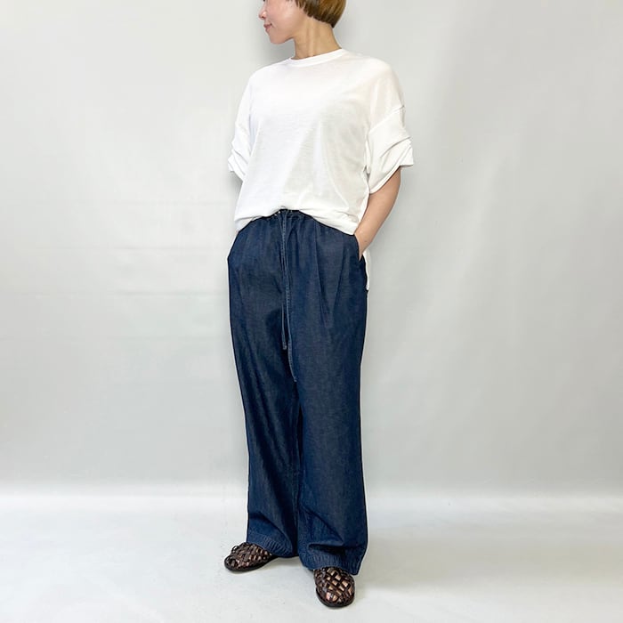ウエストストリングのデザインと絶妙なゆとりのあるワイドシルエットでラインを拾わずリラックスムード漂う一着。