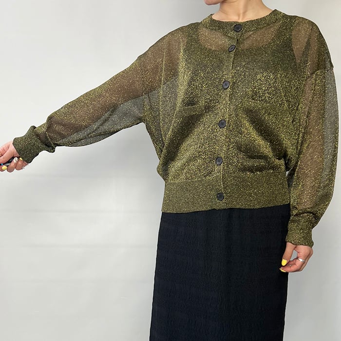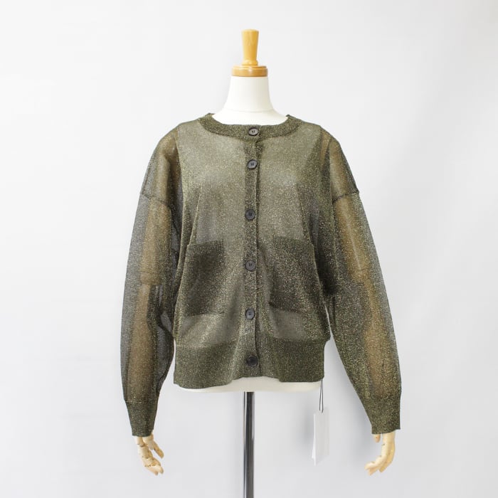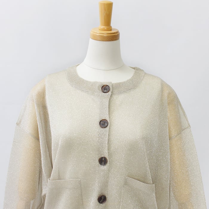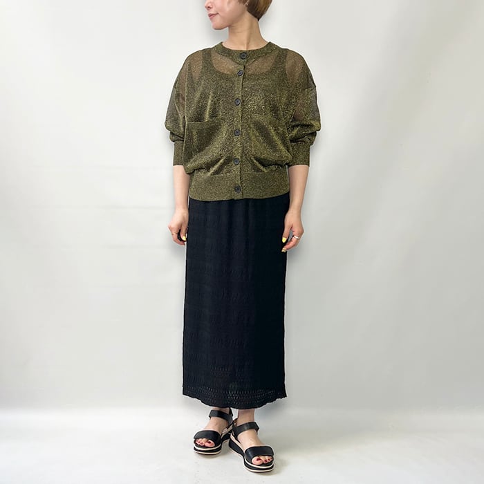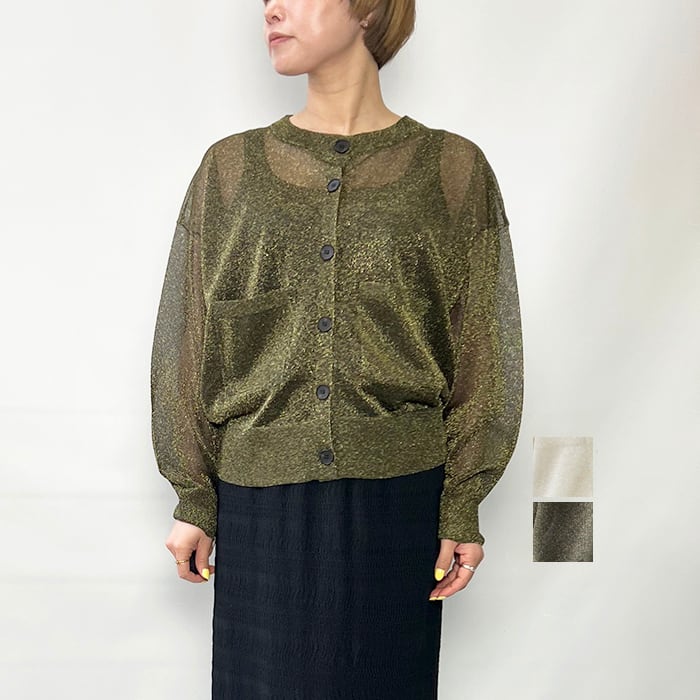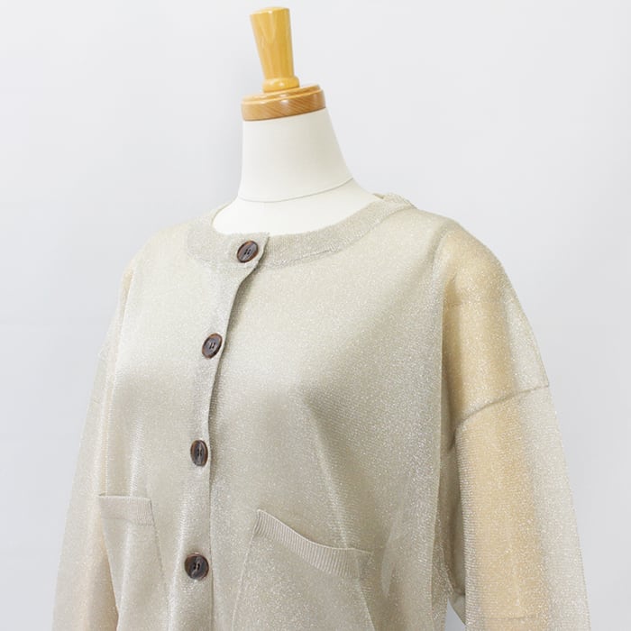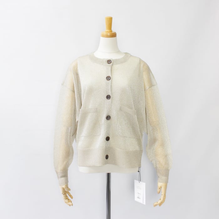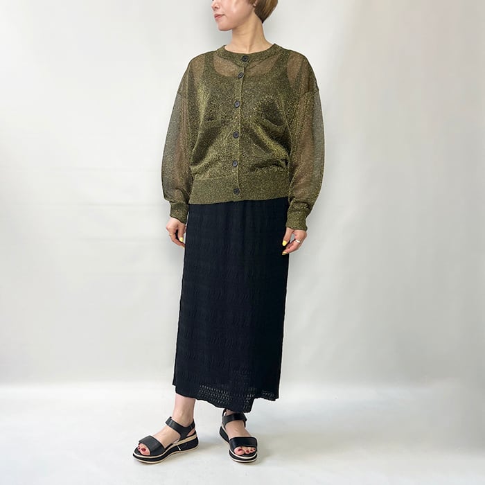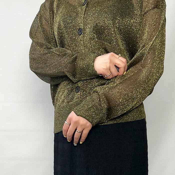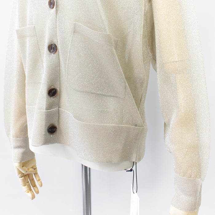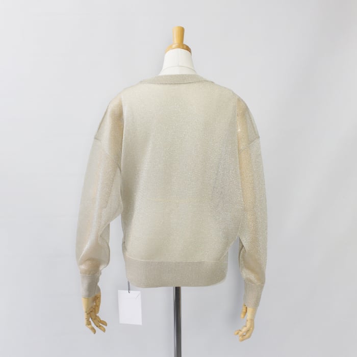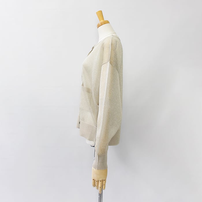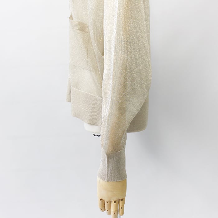極細で扁平のmetalic filamentを芯糸にゆるく巻くことでラメが自然にねじれ、光の屈折を生んで、ギラつかない、程よい度合いのラメ感を見せてくれます。