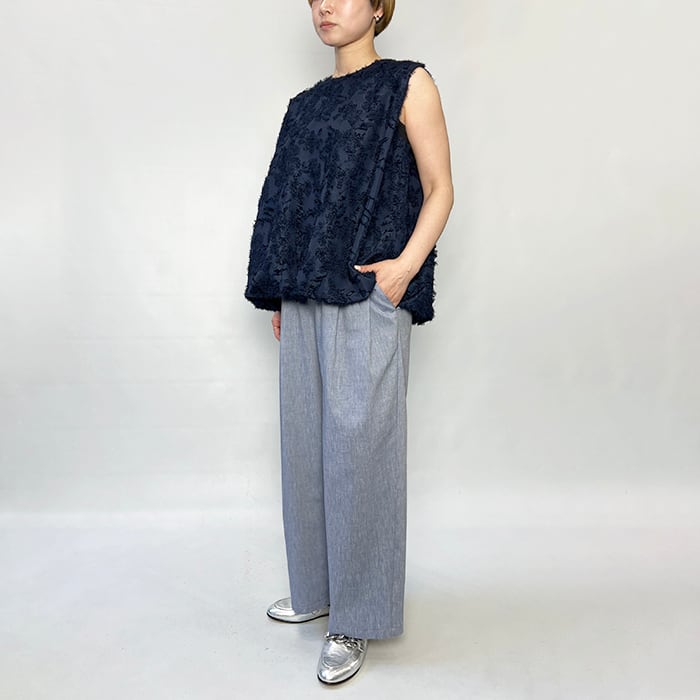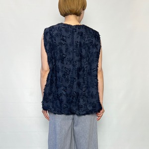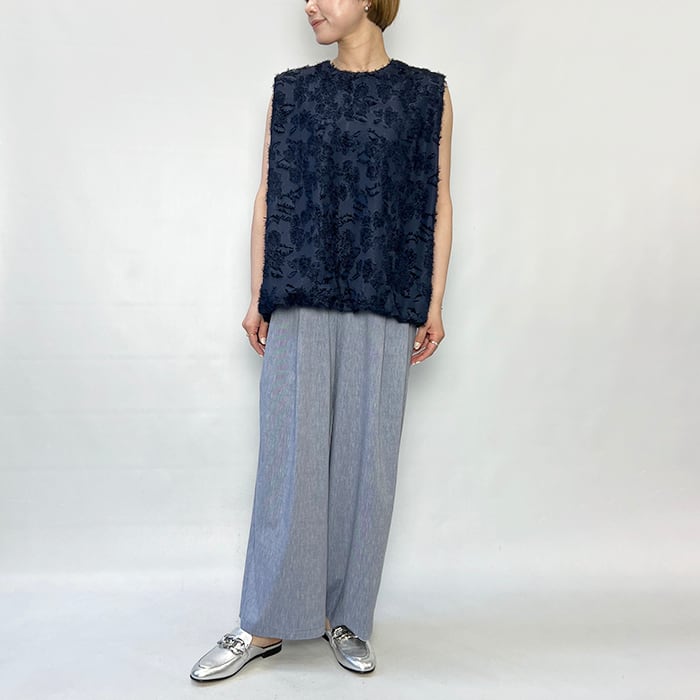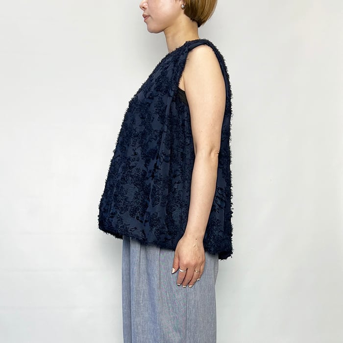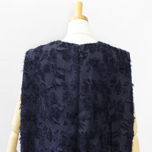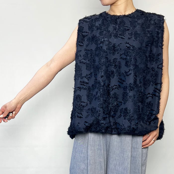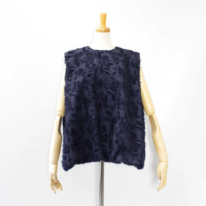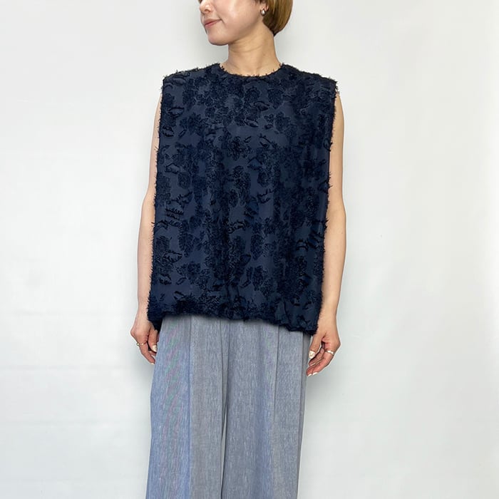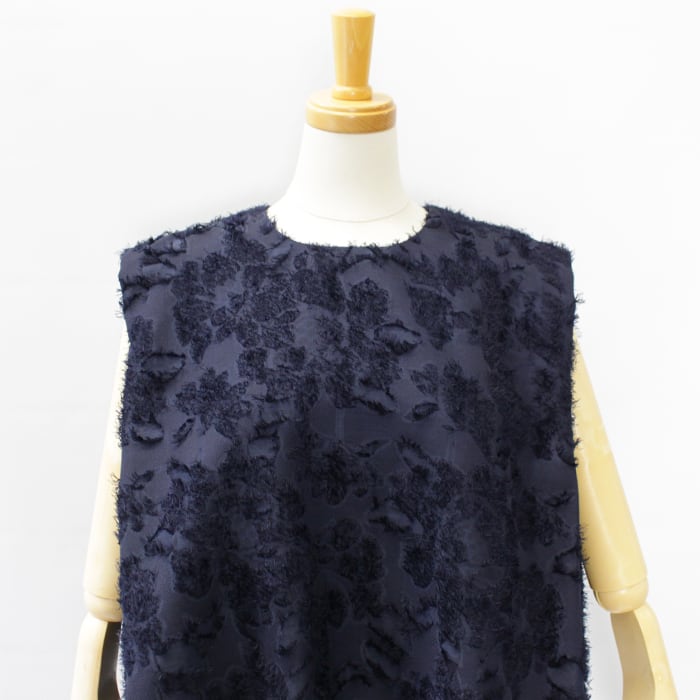大きなランダムな花柄をベースにして華やかさを表現したポリエステルジャガード素材のノースリーブブラウス。