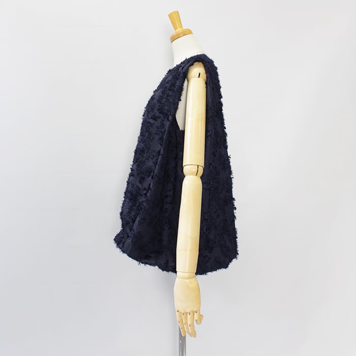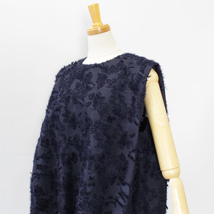 部分的に糸を飛ばし、後からその糸をカットする手法を用いる事でより表情のある花柄を表現しています。