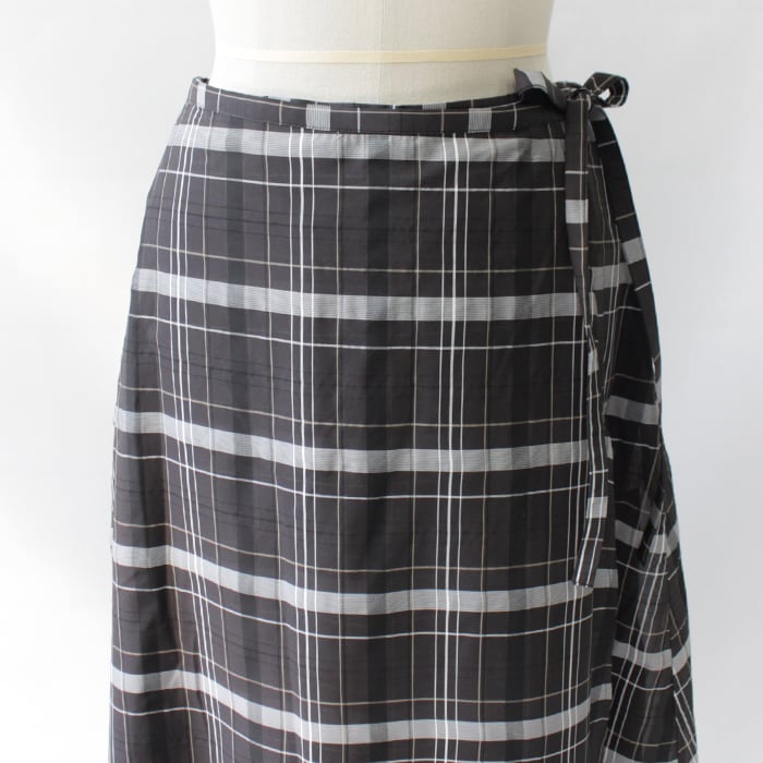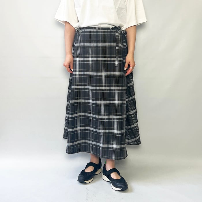 ややハリ感のあるドライタッチなチェック柄ラップスカート。