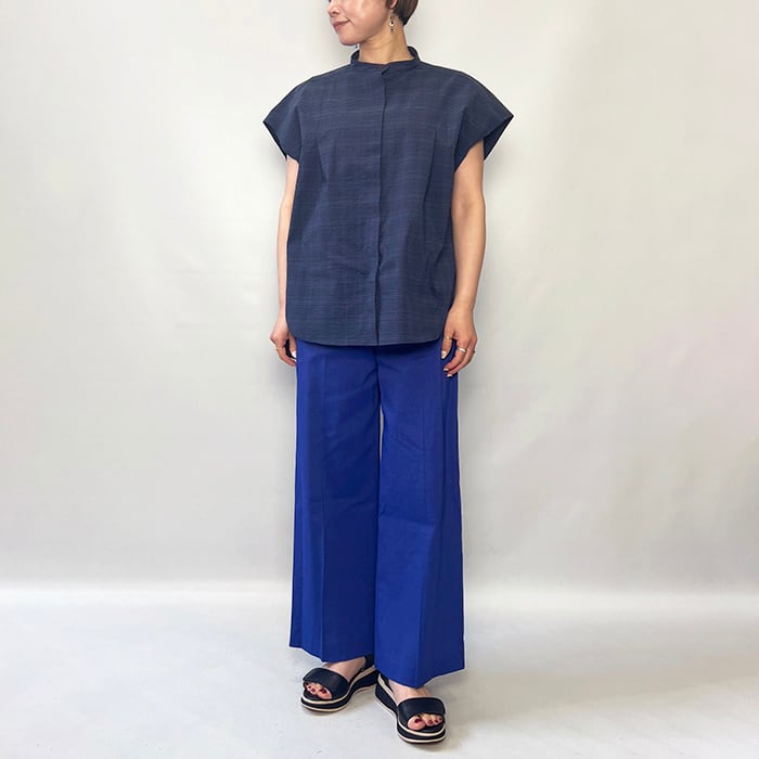 首元を上品に覆うスタンドカラーが顔まわりをシャープに引き締め、構築的なフレンチスリーブは腕をスッキリと見せつつモードな雰囲気を演出。