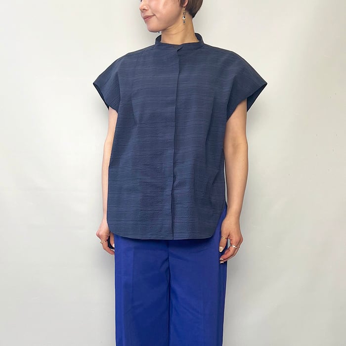 繊細なサッカーの表情が特徴の先染め素材のブラウス。