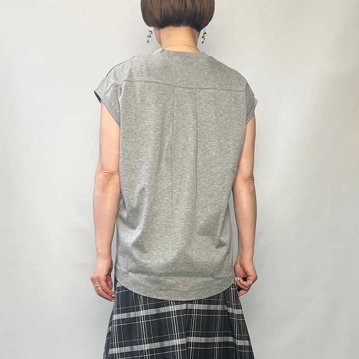 ほどよいフィット感にフレンチスリーブのデザインが女性らしいニュアンスをプラスし、やや短めの着丈はさまざまなボトムともレイヤードしやすいので1枚でもこなれた印象に。