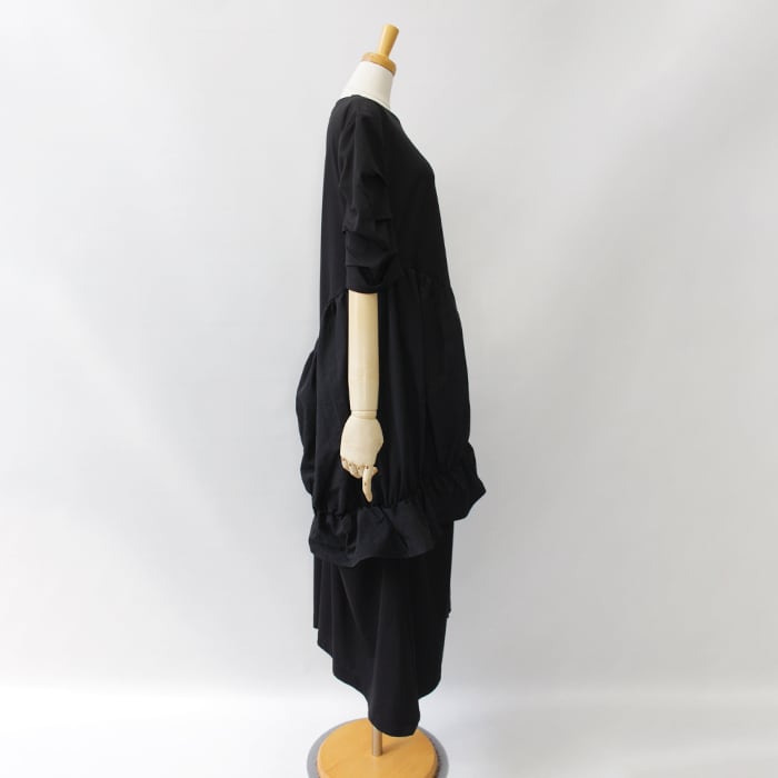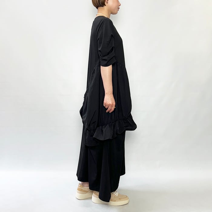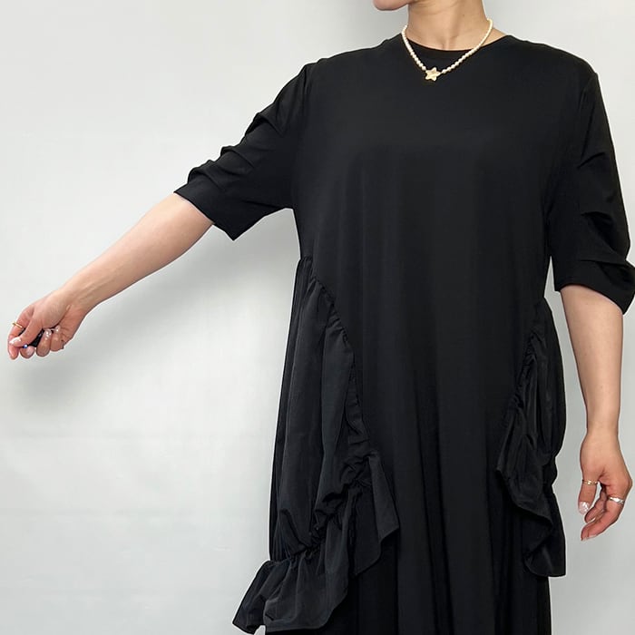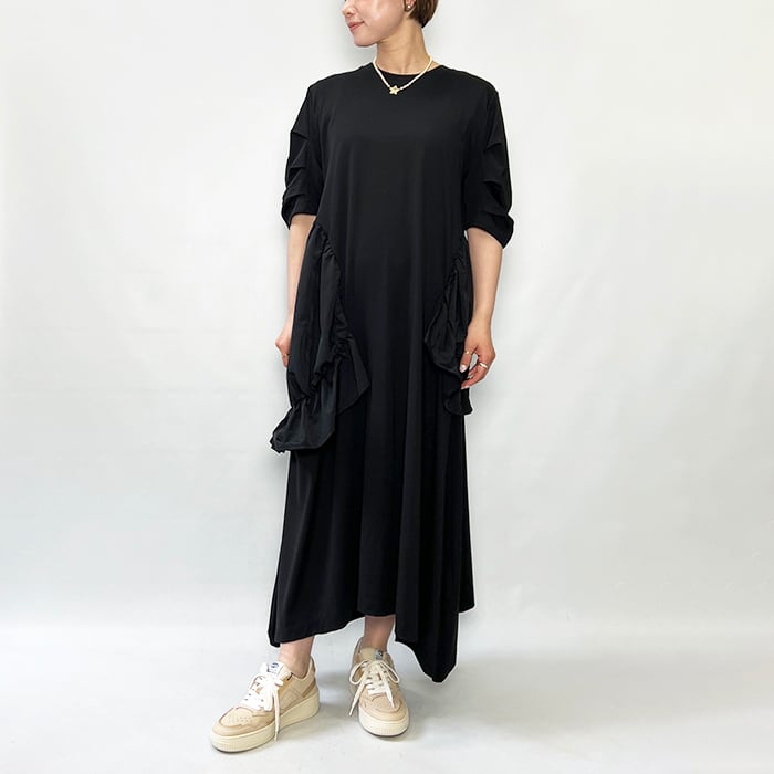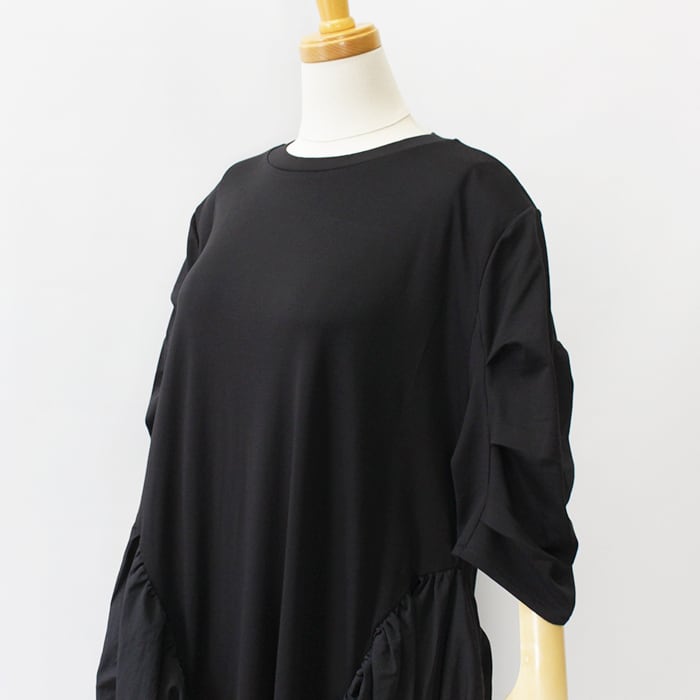 女性らしいA ラインのシルエットでサイドの布帛切り替えのデザインがポイント。