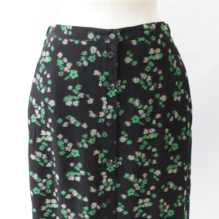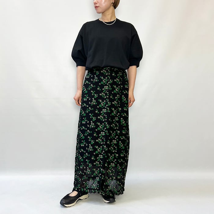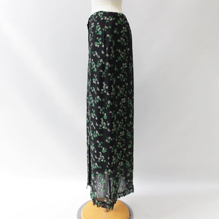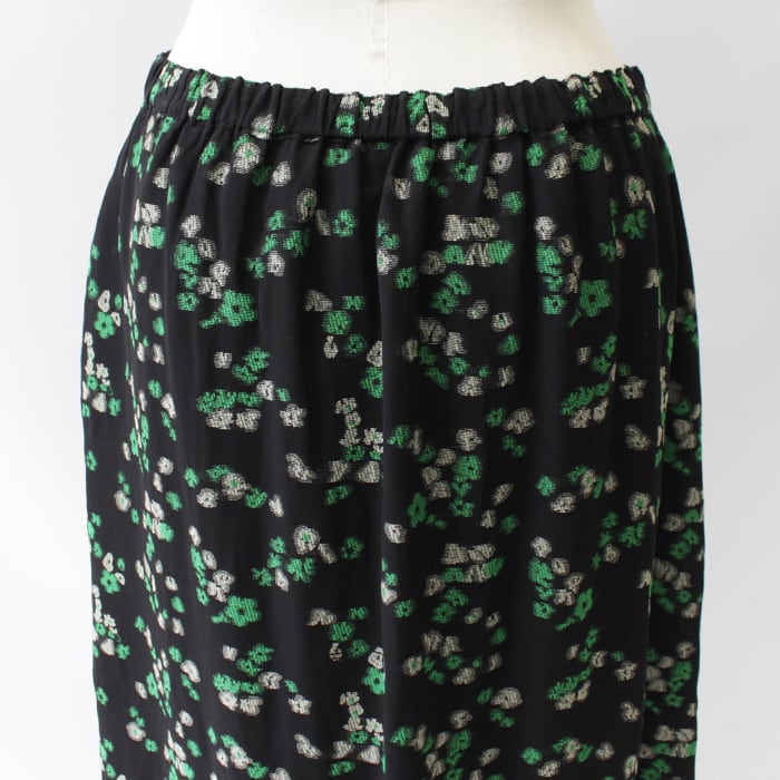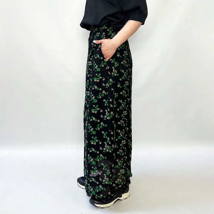 オリジナルの上品なグリーンの小花柄と、後ろウエストをゴム仕様で仕上げたリラックスした穿き心地が爽やかな夏のおしゃれを演出。