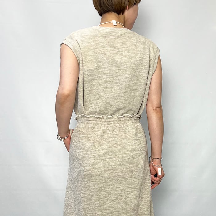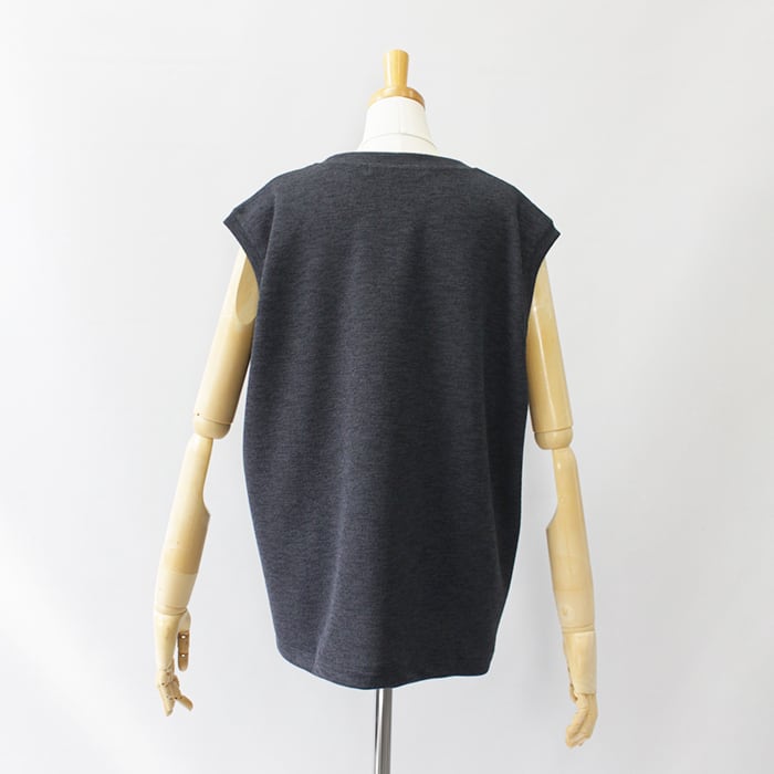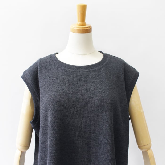 リネンのような表情を持つ麻調合繊のダブルフェイスジャージーのトップス。