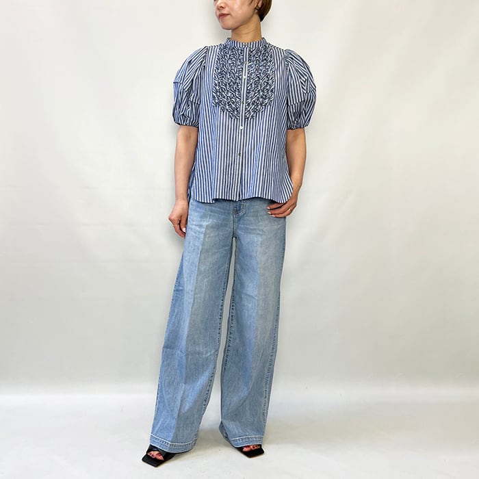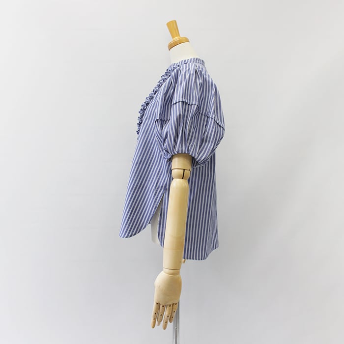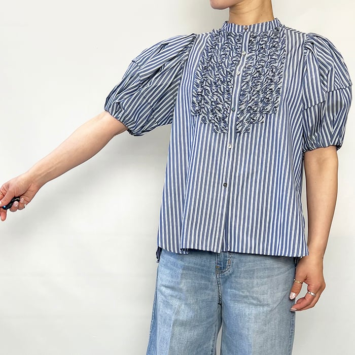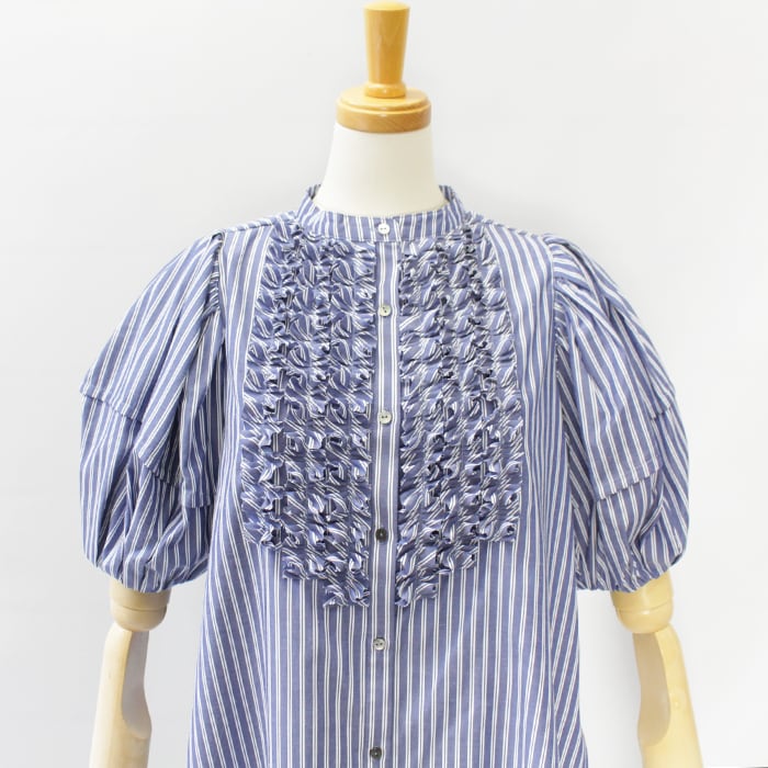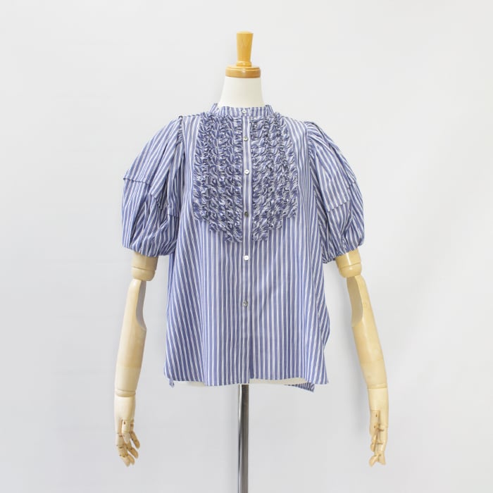 特殊ミシンでつくる立体的なバイヤスタックフリルは、顔まわりを華やかに仕上げてくれるアクセサリーいらずの主役ブラウス。