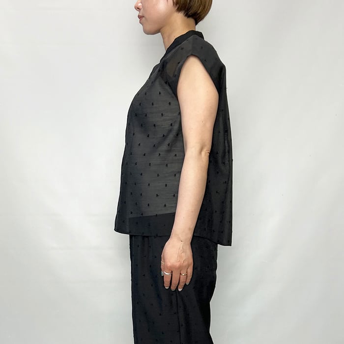 軽やかな素材感を活かし、ワイドパンツやリネンスカートに合わせてエレガントなサマースタイルに。