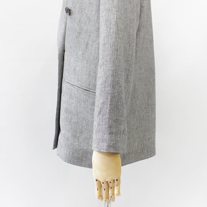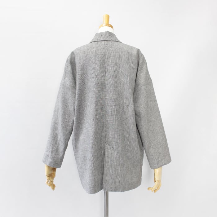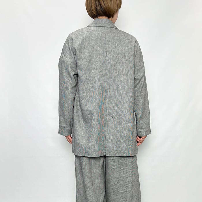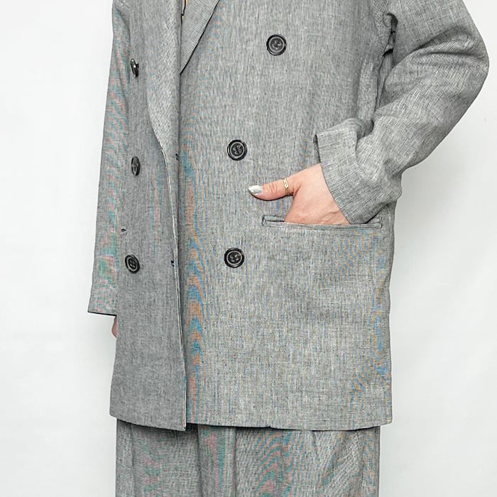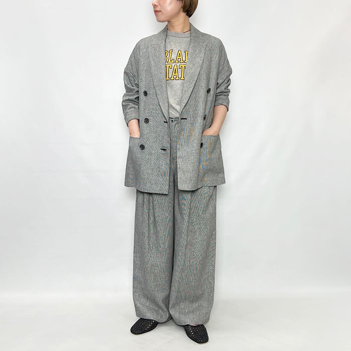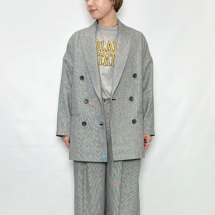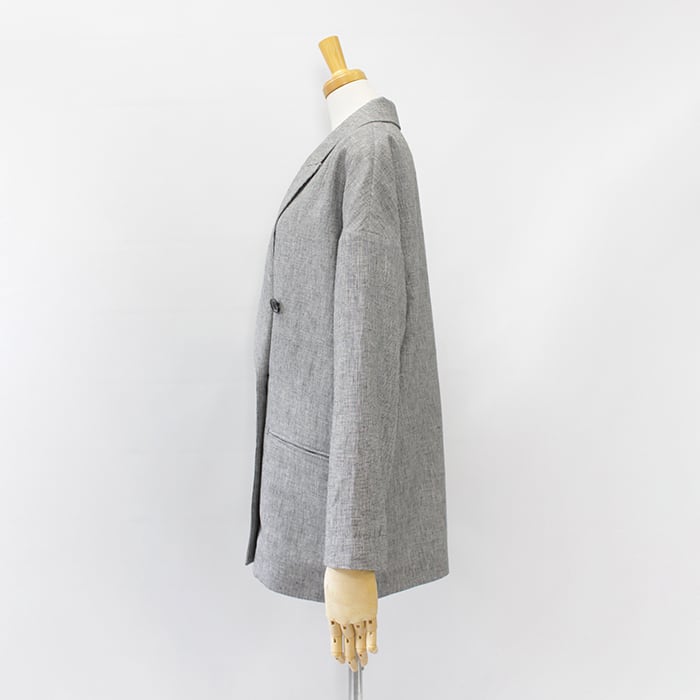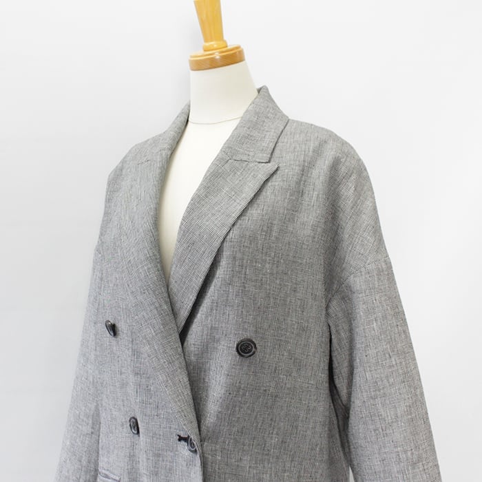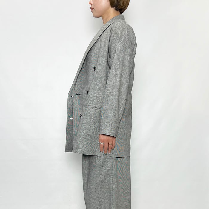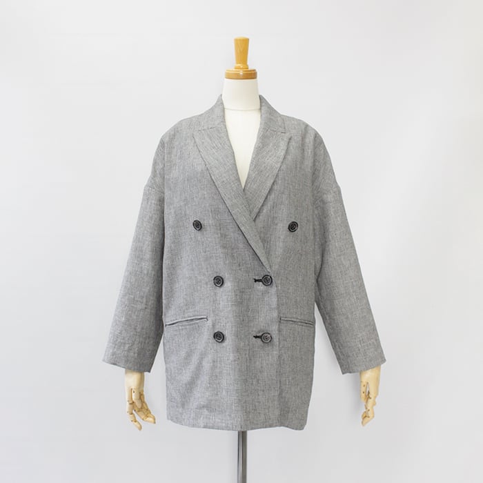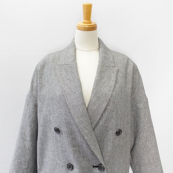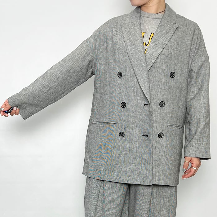 伝統的なマニッシュなデザインをベースにしつつ、ドロップショルダーとワイドな身幅で現代的なオーバーサイズシルエットに仕上げた軽やかなダブルブレストジャケット。
